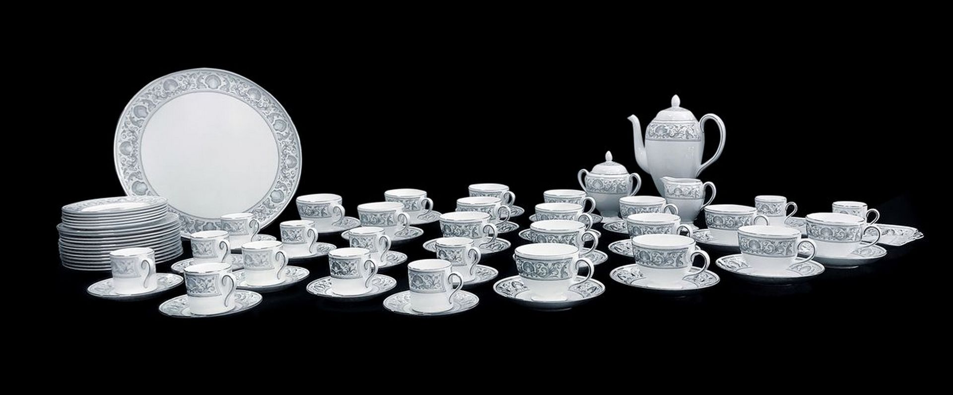 Wedgwood Made in England - Servizio in porcellana da dolci, the e caffe per 12 persone. Modello Dolphins, Bone china porcellana Servizio realizzato su commissione privata composto da: 16 tazze da te con piattini, 12 tazzine da caffe con piattini, tortiera, lattiera, zuccheriera, vassoio rettangolare da tet a tet. 12 piattini dolce, 6 piattini.