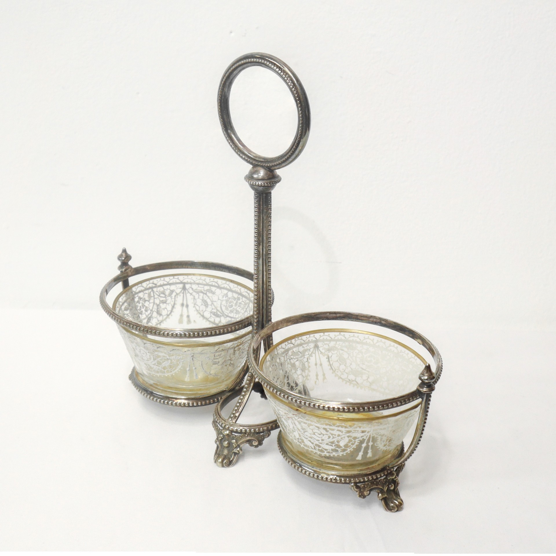 Salsiera in silver e vetro decorato h cm 24,5 iscrizione sul fondo G.R.COLLIG 130 REGENT ST.LONDON iscrizione sul fondo G.R.COLLIG 130 REGENT ST.LONDON