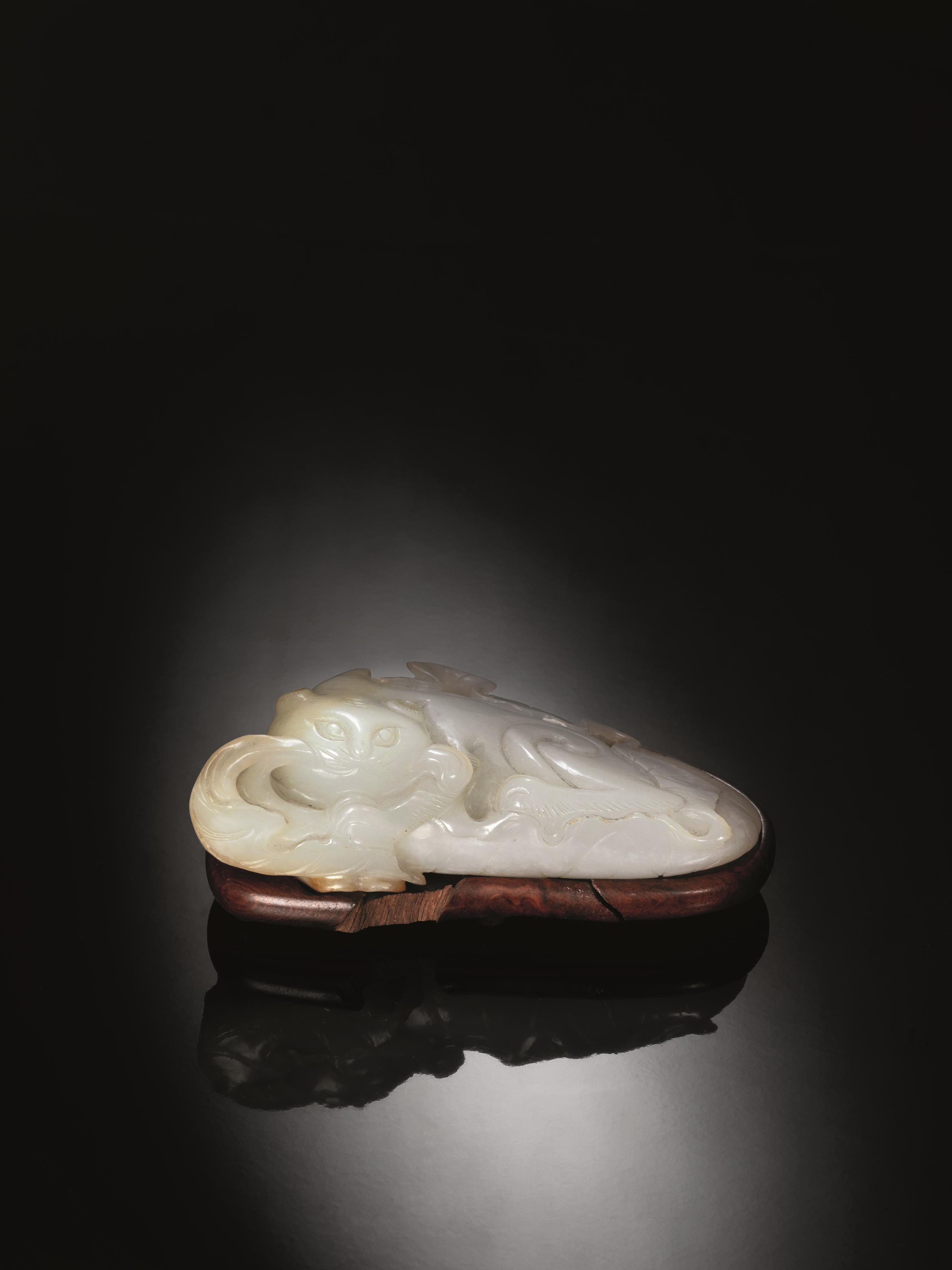 Intaglio Cina dinastia qing in giada verde pallido con inclusioni ruggine,...