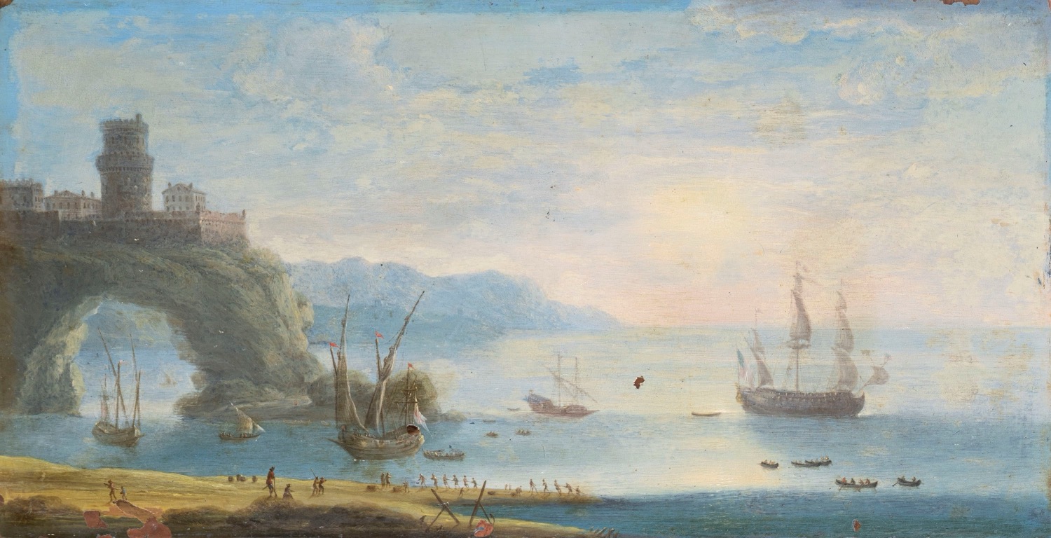 Lot 26 | Orazio Grevenbroek (attivo a Napoli, circa 1670 - 1730) - Paesaggio costiero con arco roccioso e velieri in lontananza