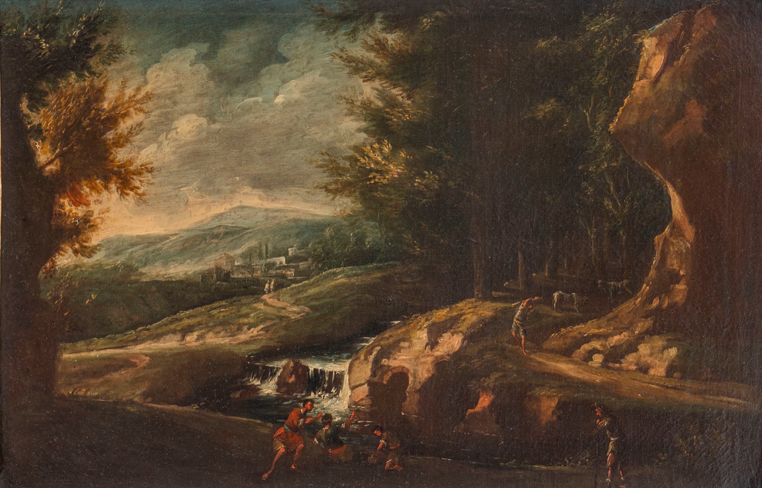 Lot 81 | Scuola romana, fine secolo XVII - inizi secolo XVIII - Paesaggio fluviale con figure