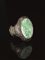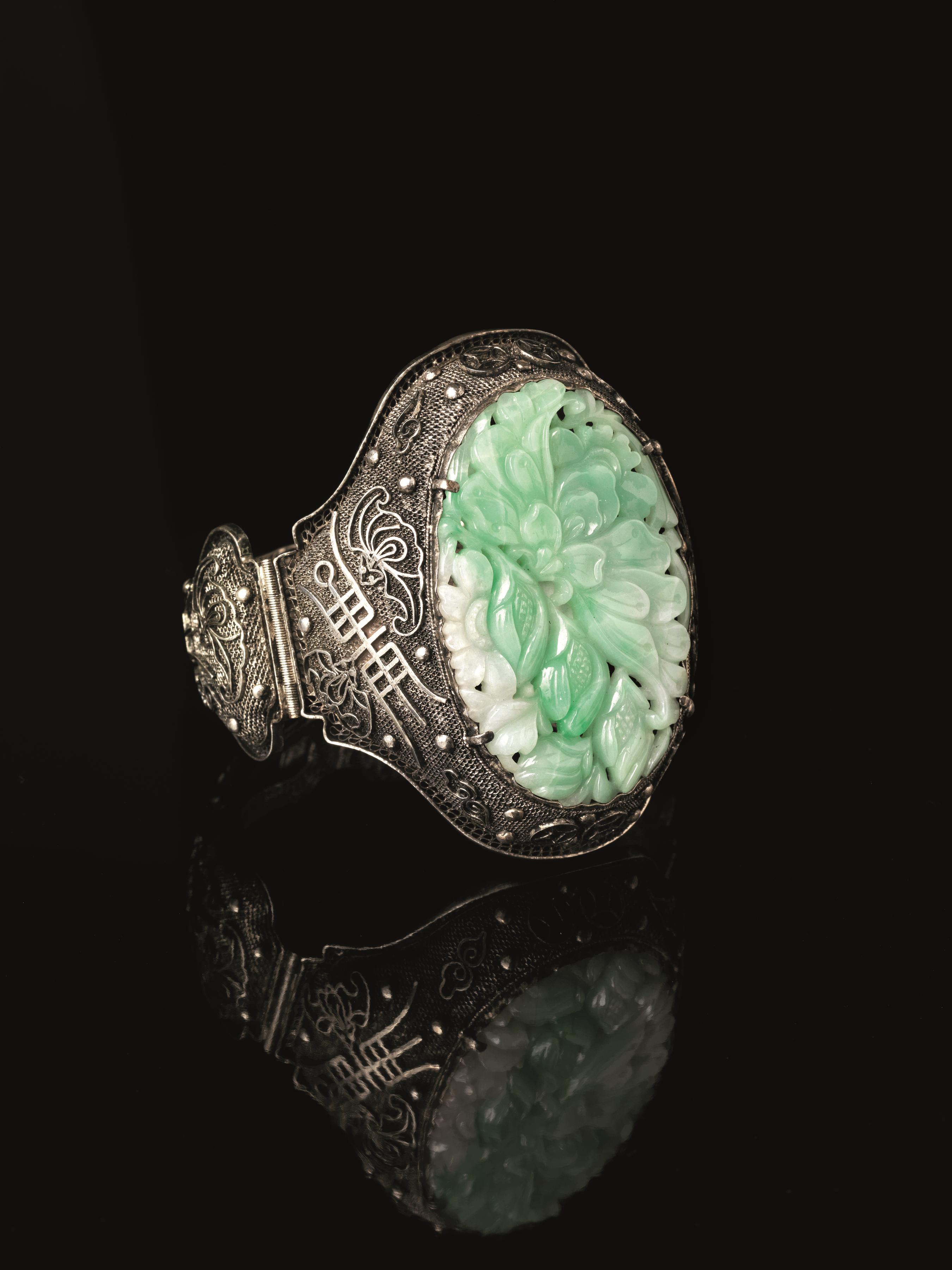 in argento dorato al traforo decorato con pipistrelli e simboli con grande placca centrale in giadeite verde smeraldo intagliata con motivi floreali