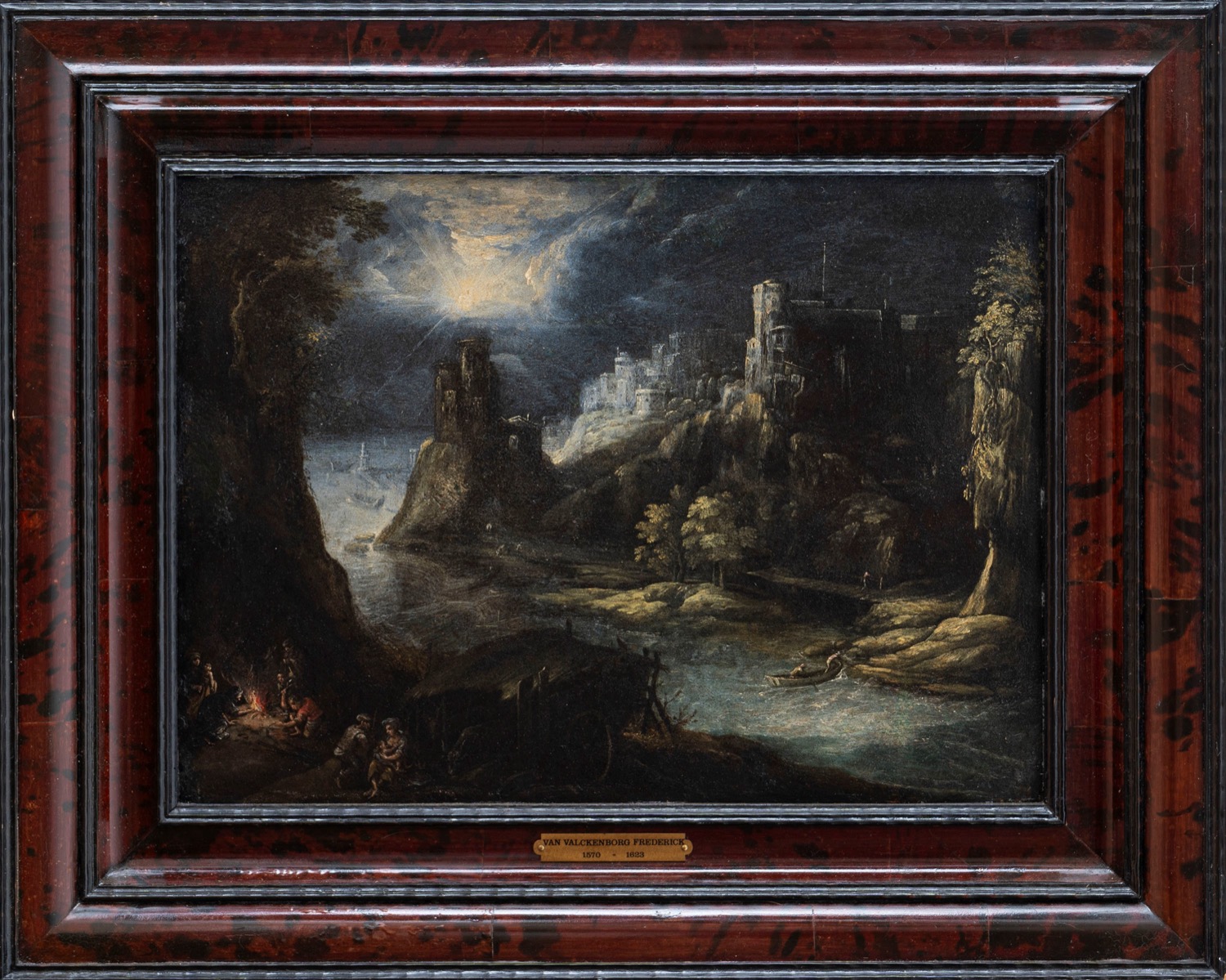 Lot 106 | Ambito di Paul Bril (Anversa 1554 – Roma 1626) - Paesaggio fluviale al chiaro di luna con figure e fortezza in lontananza