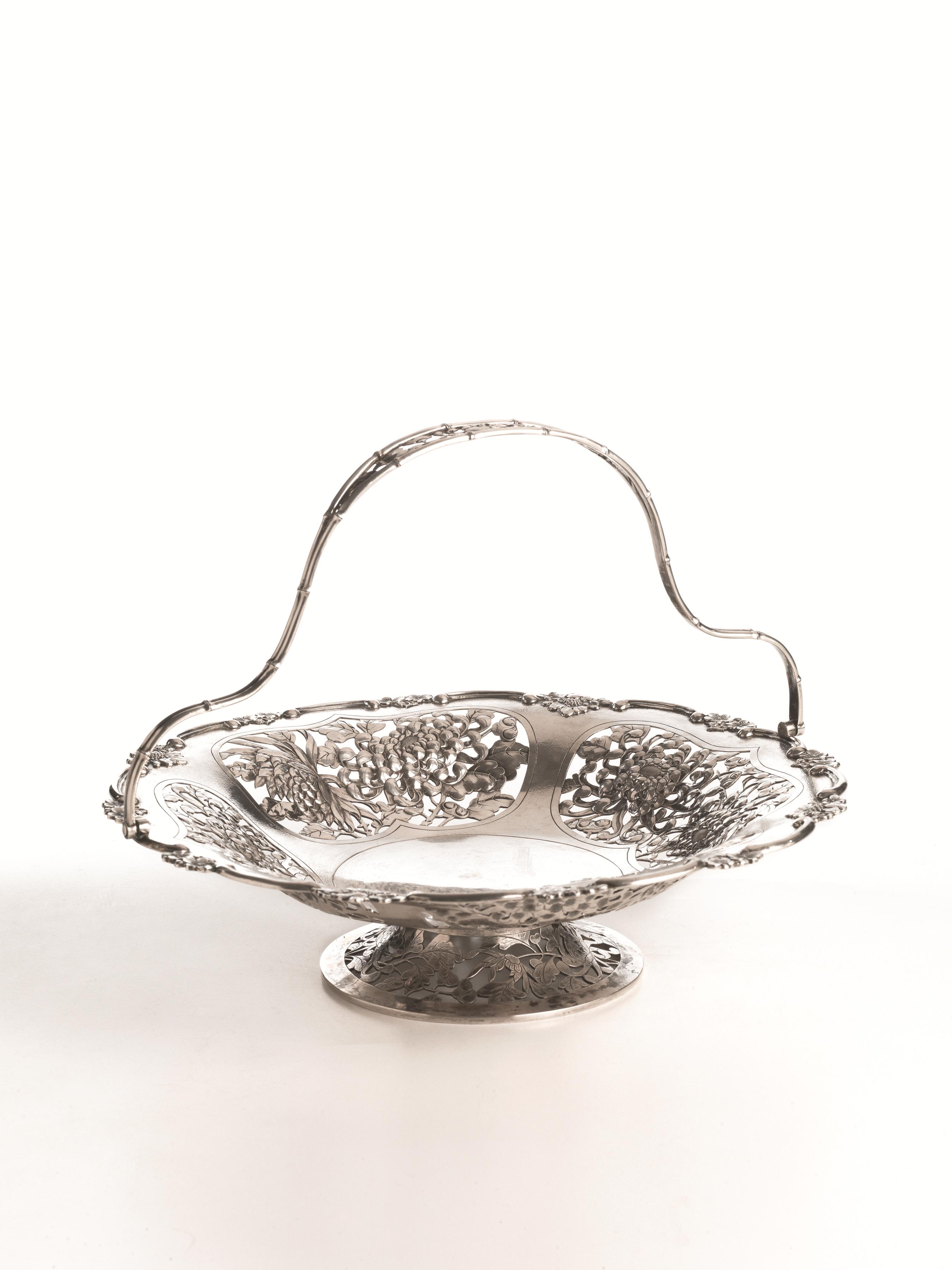 in argento della manifattura di Canton finemente decorata a traforo con fiori, diam. cm 28