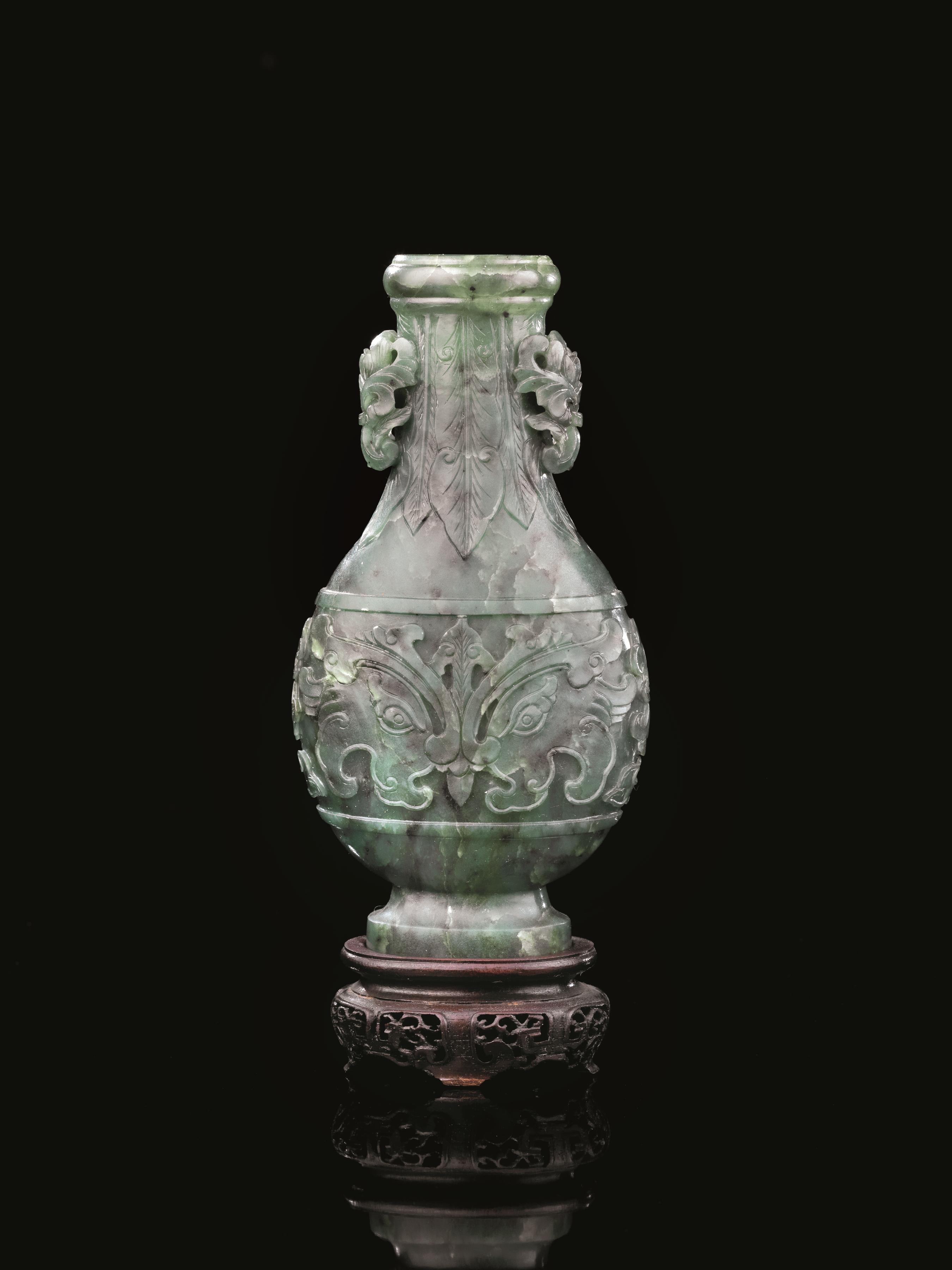 VASETTO HU, CINA, DINASTIA QING, sec. xixin giada verde spinacio, decorato...