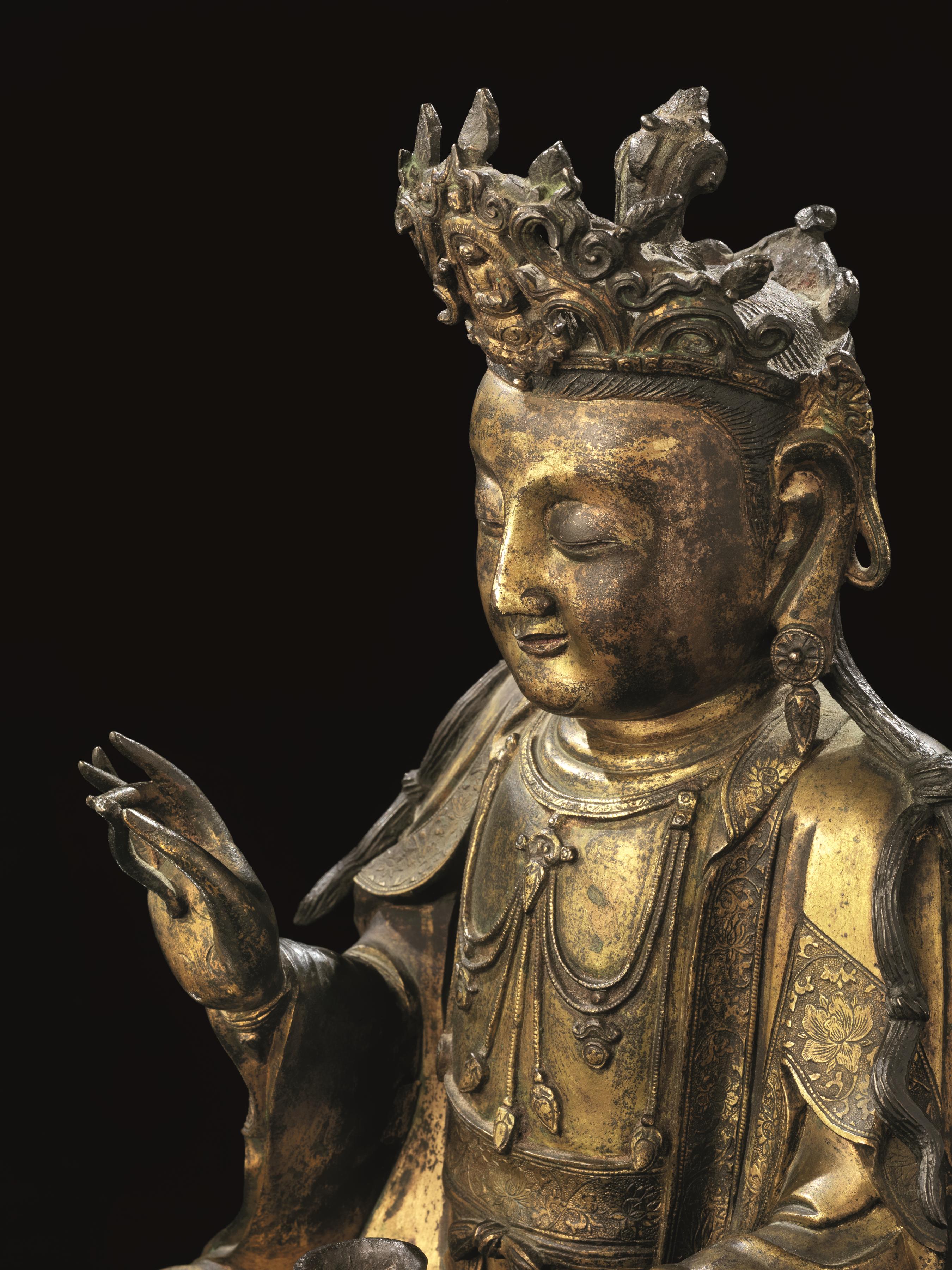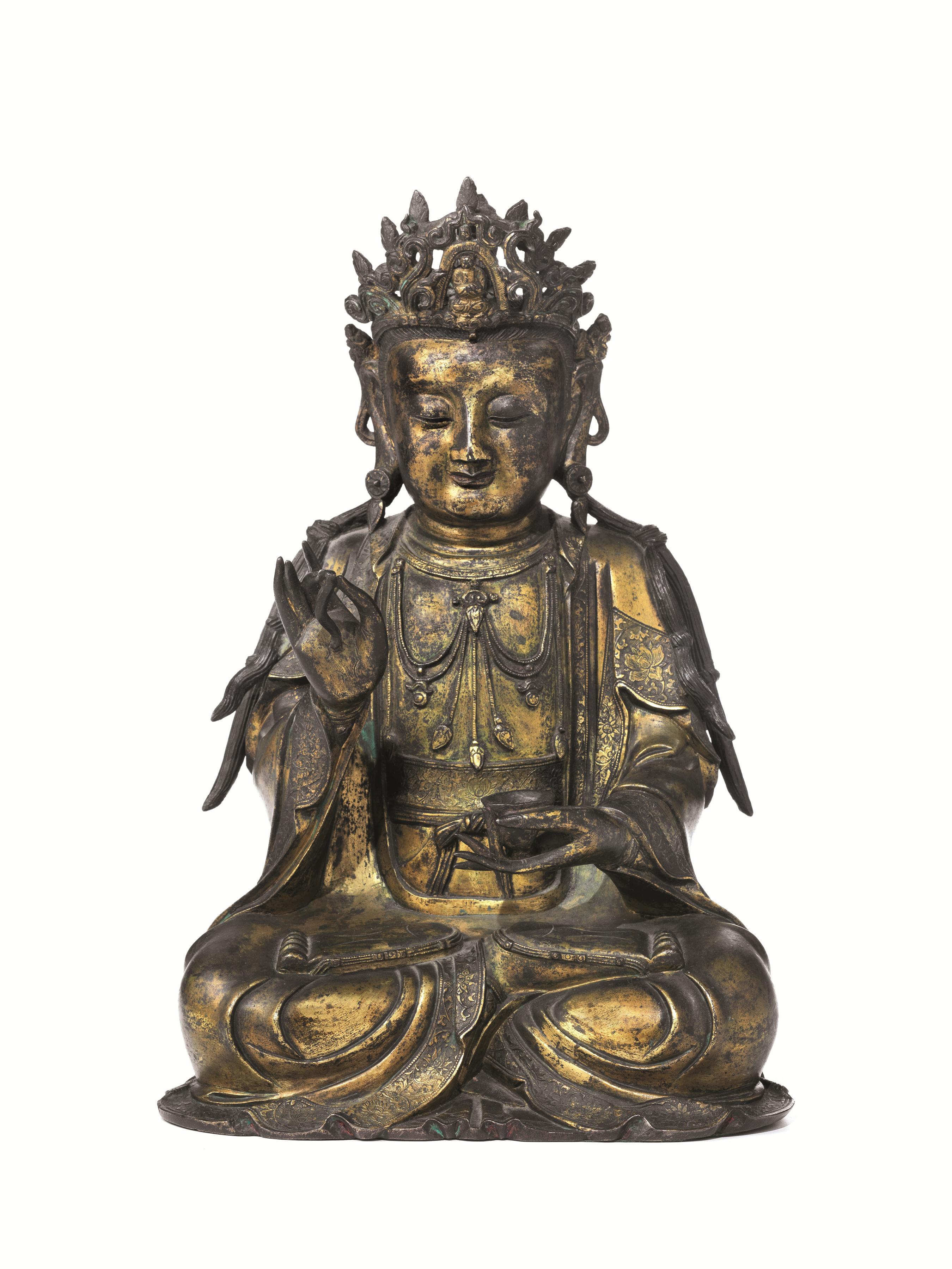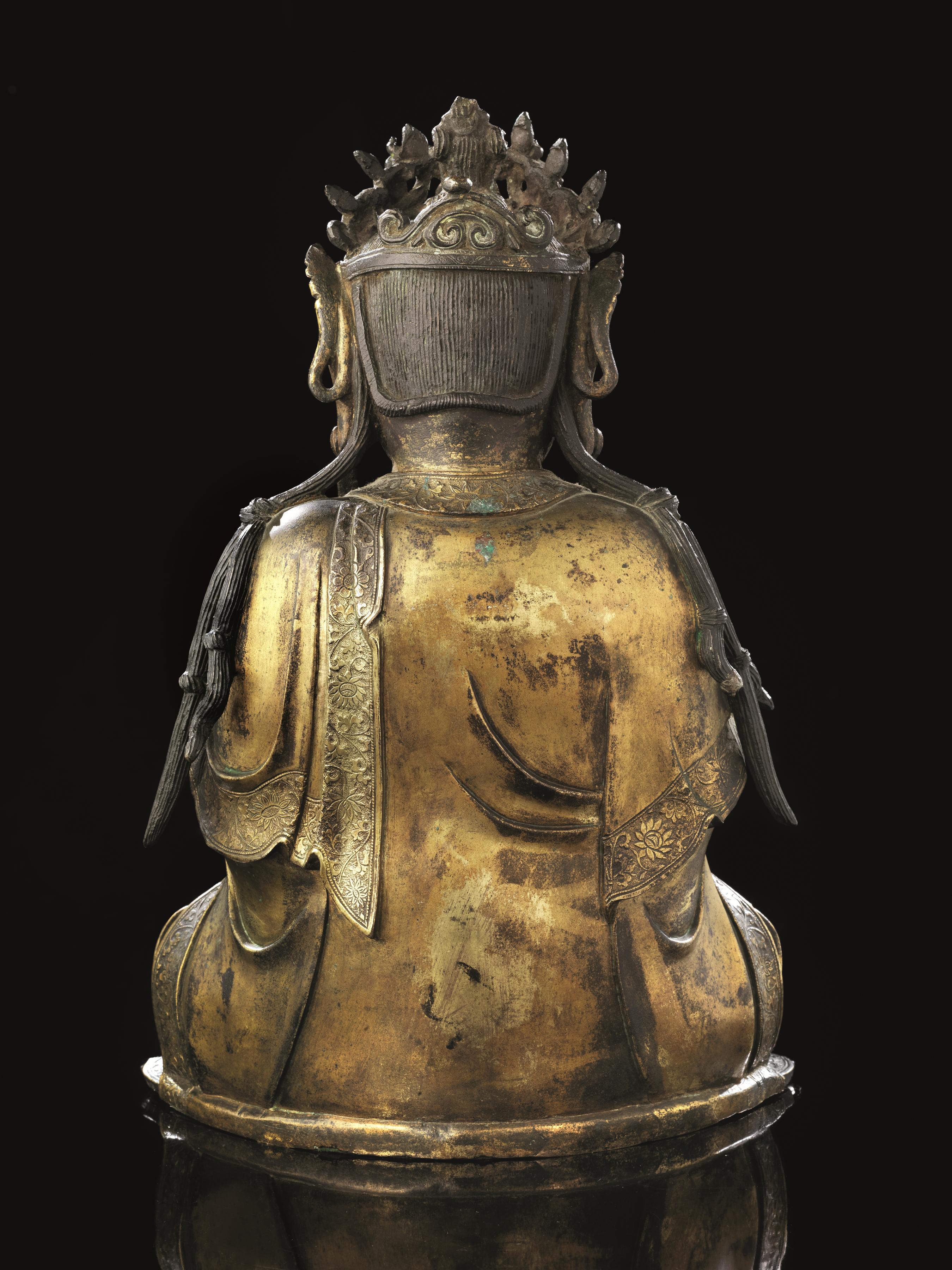 in bronzo dorato raffigurante Guanyin assisa in dhyanasana, la mano destra regge un ramoscello di salice e la sinistra una coppa; il volto, con espressione contemplativa, è sormontato da una elaborata corona a più punte, centrate dalla figura dell’Amitabha Buddha, il bhodistva elegantemente vestito con una morbida veste fluente e con un bordo floreale finemente cesellato, alt. cm 36