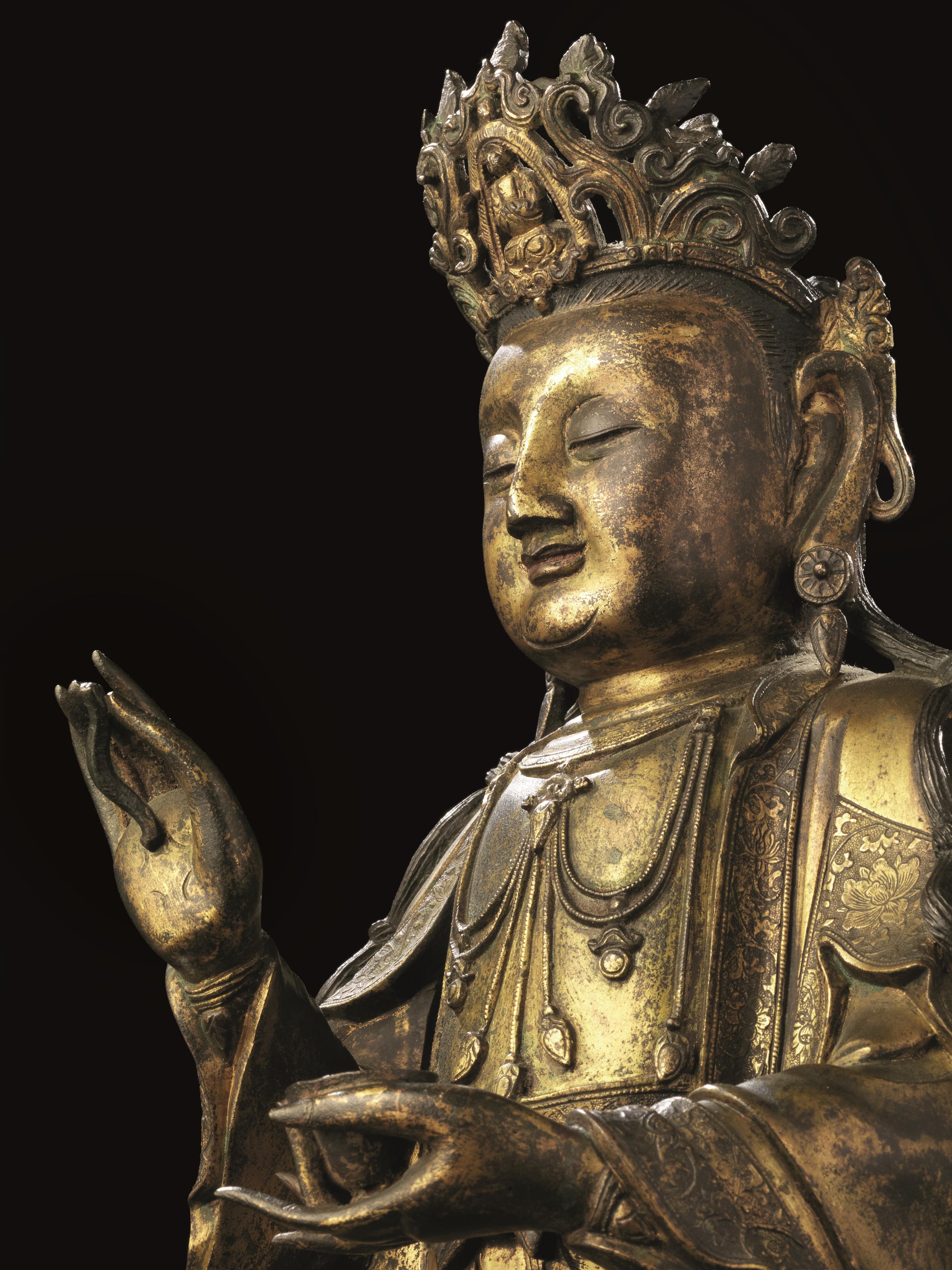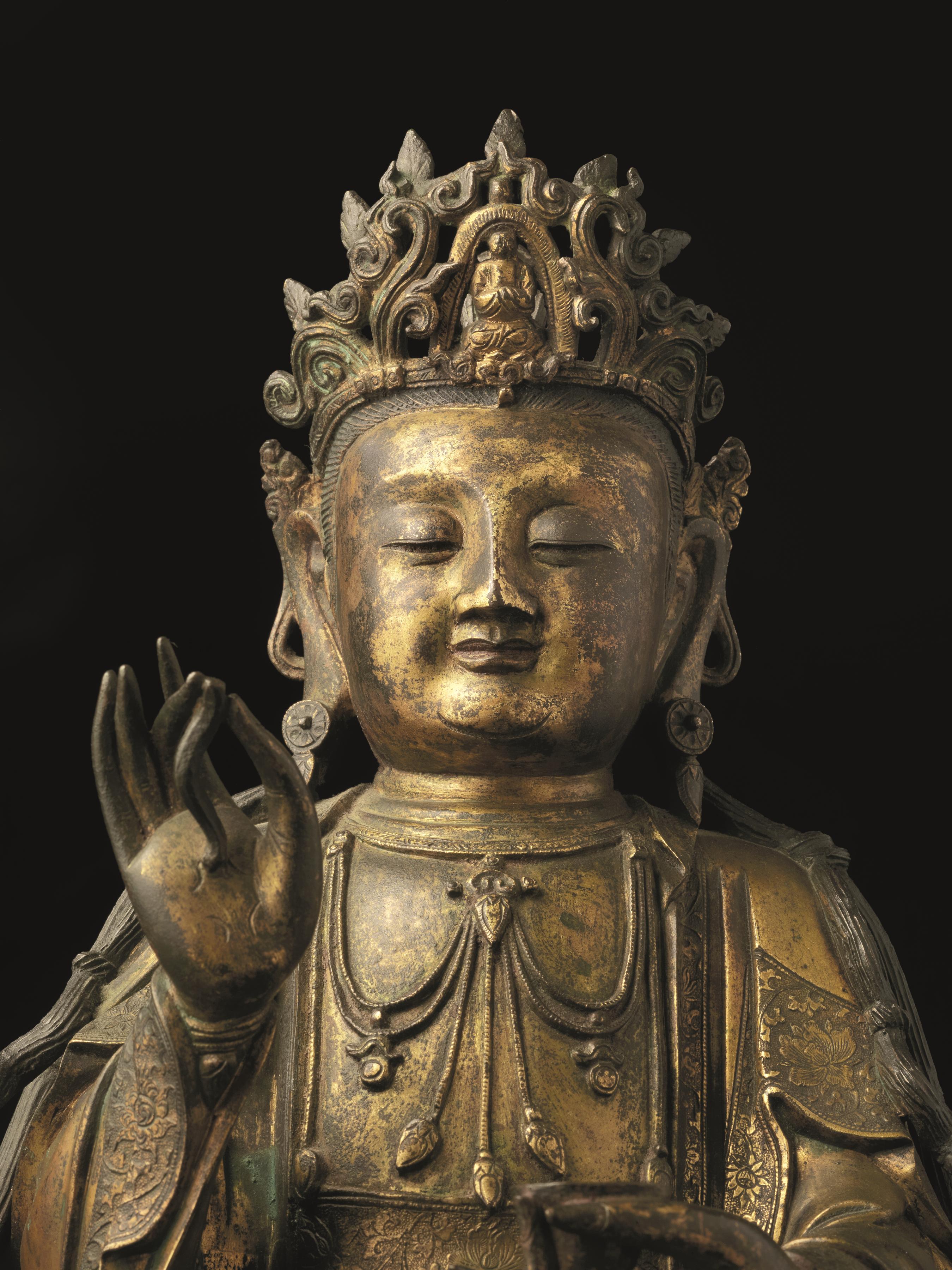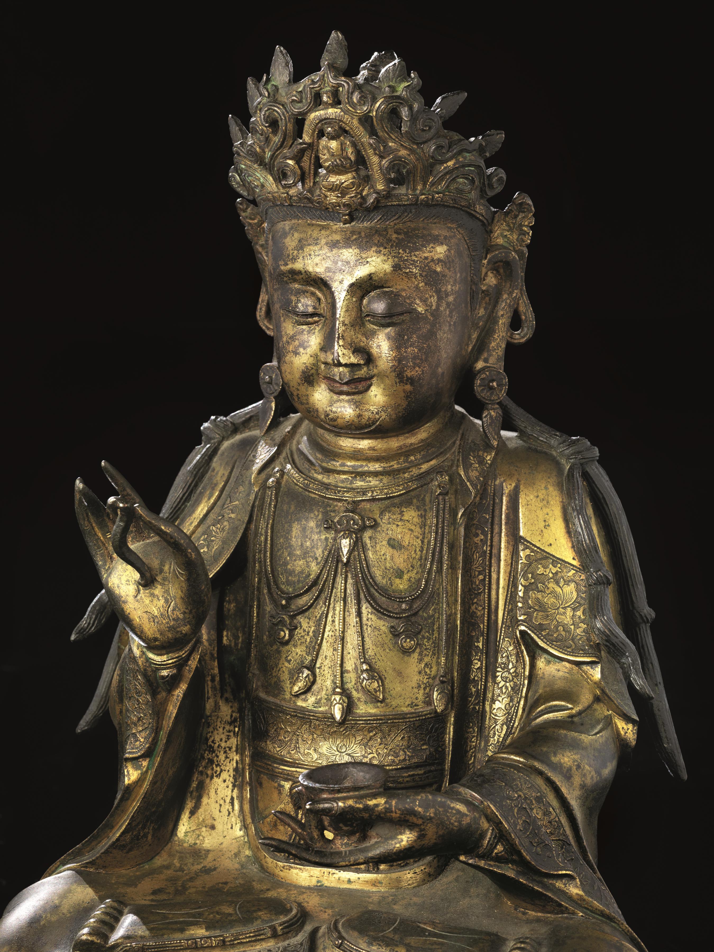 in bronzo dorato raffigurante Guanyin assisa in dhyanasana, la mano destra regge un ramoscello di salice e la sinistra una coppa; il volto, con espressione contemplativa, è sormontato da una elaborata corona a più punte, centrate dalla figura dell’Amitabha Buddha, il bhodistva elegantemente vestito con una morbida veste fluente e con un bordo floreale finemente cesellato, alt. cm 36