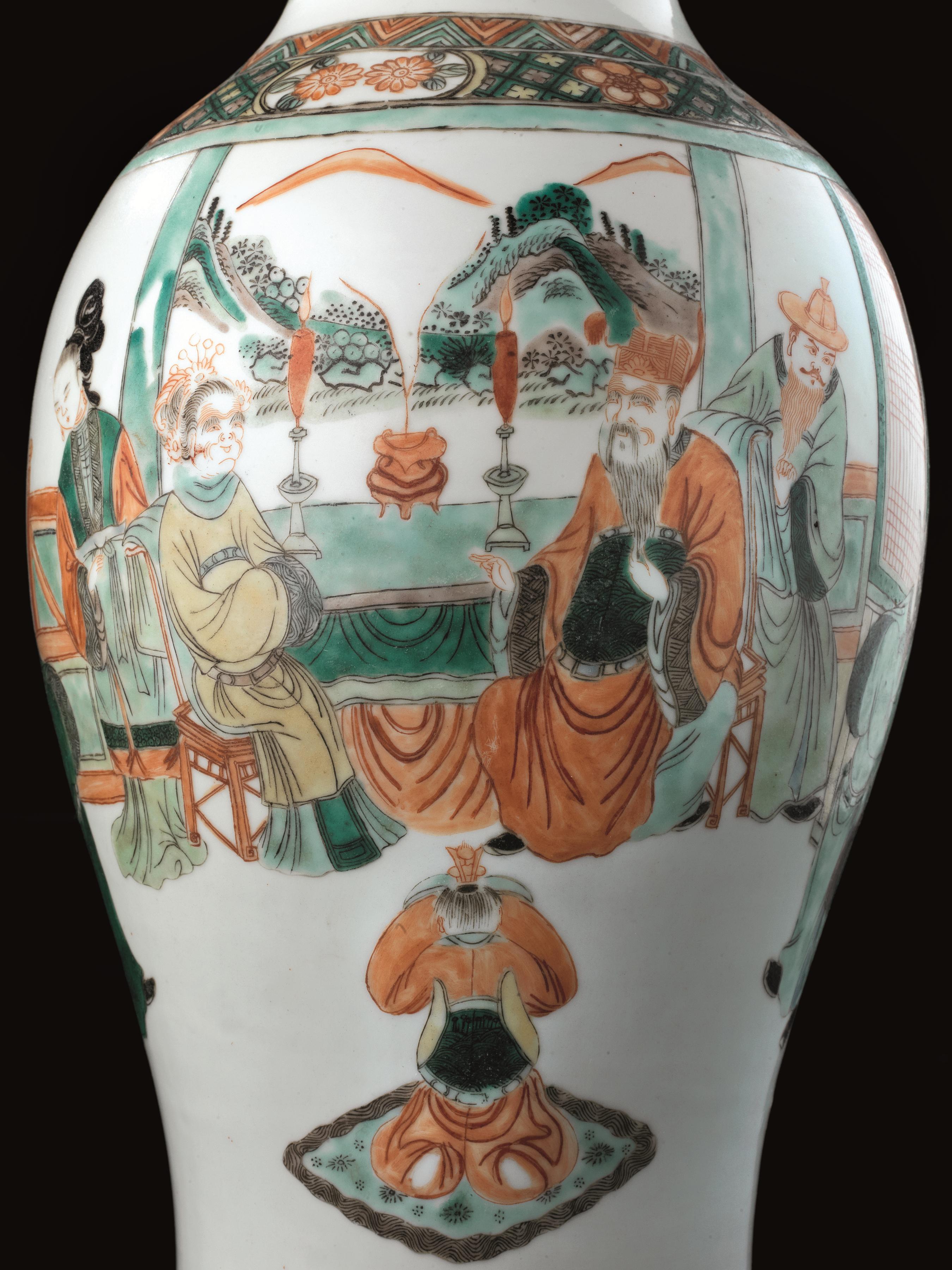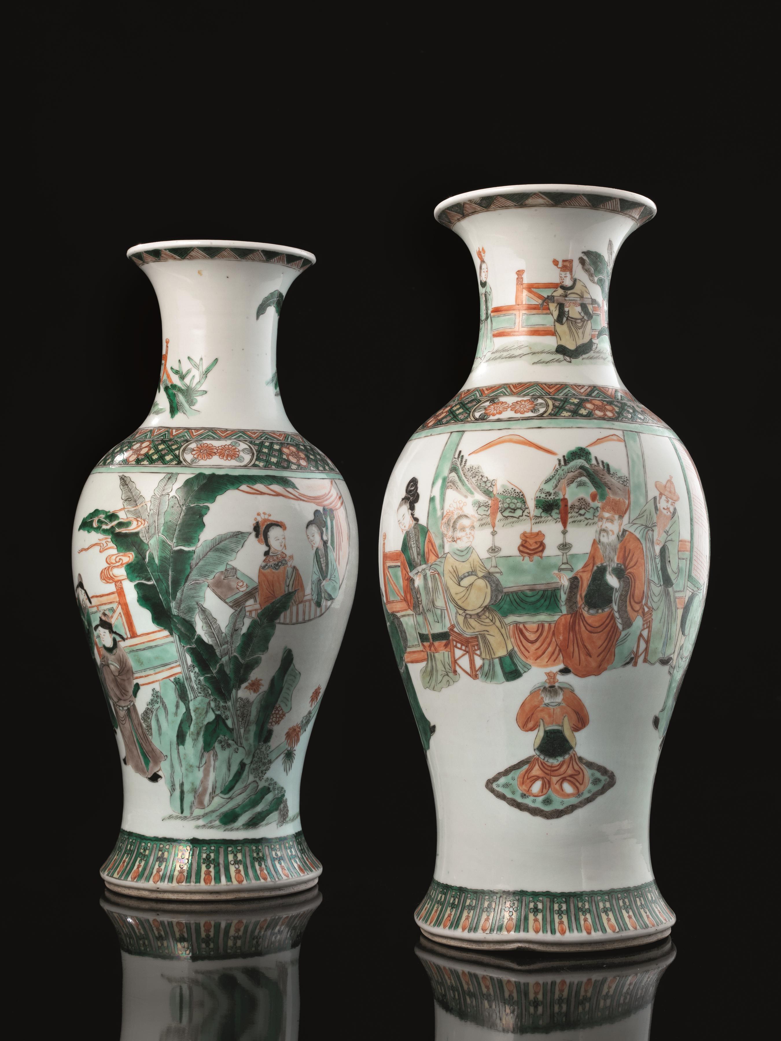 in porcellana della famiglia verde, decorati con scene di vita di corte