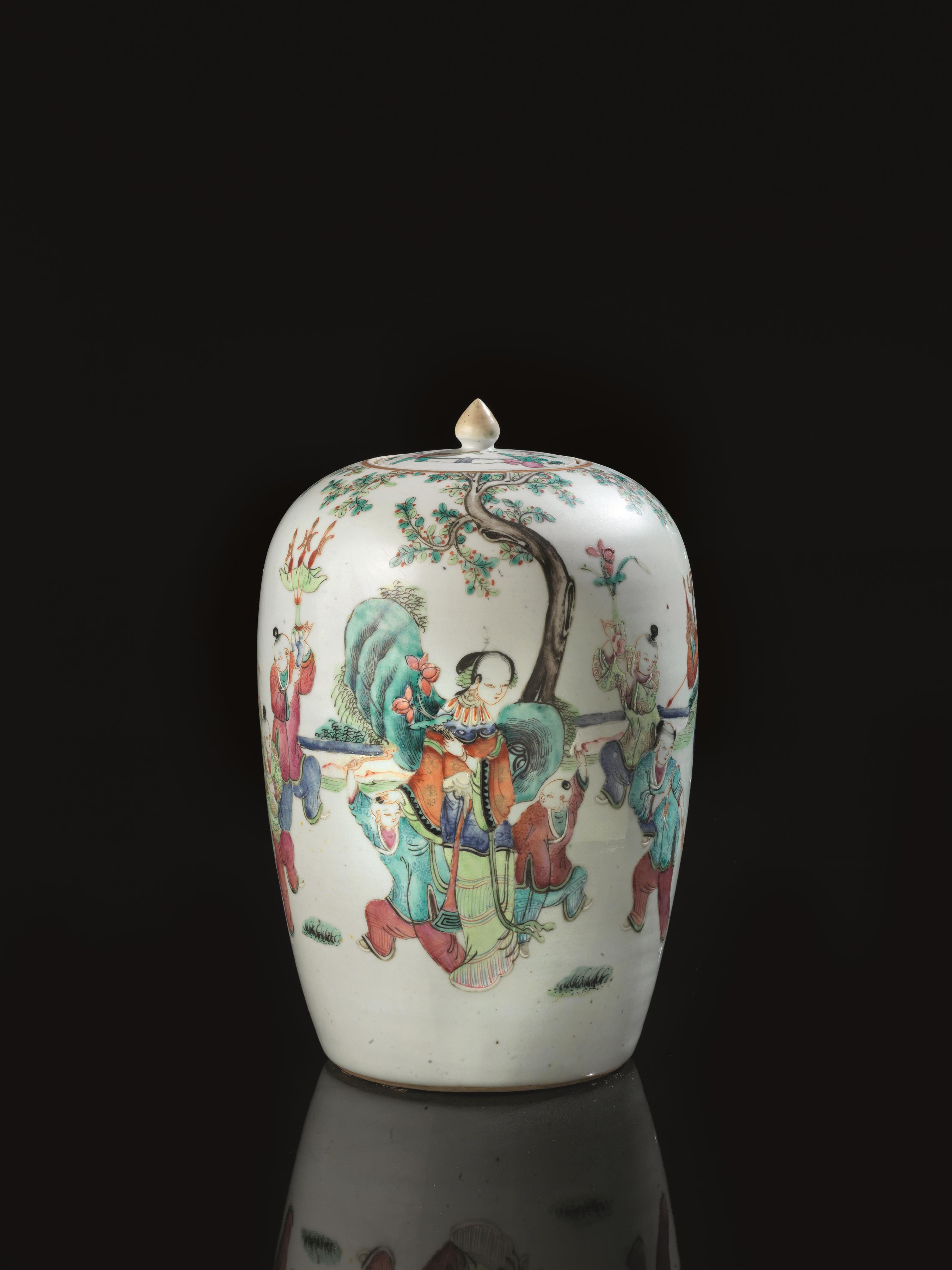 in porcellana della famiglia rosa decorato con figure, alt. cm 32