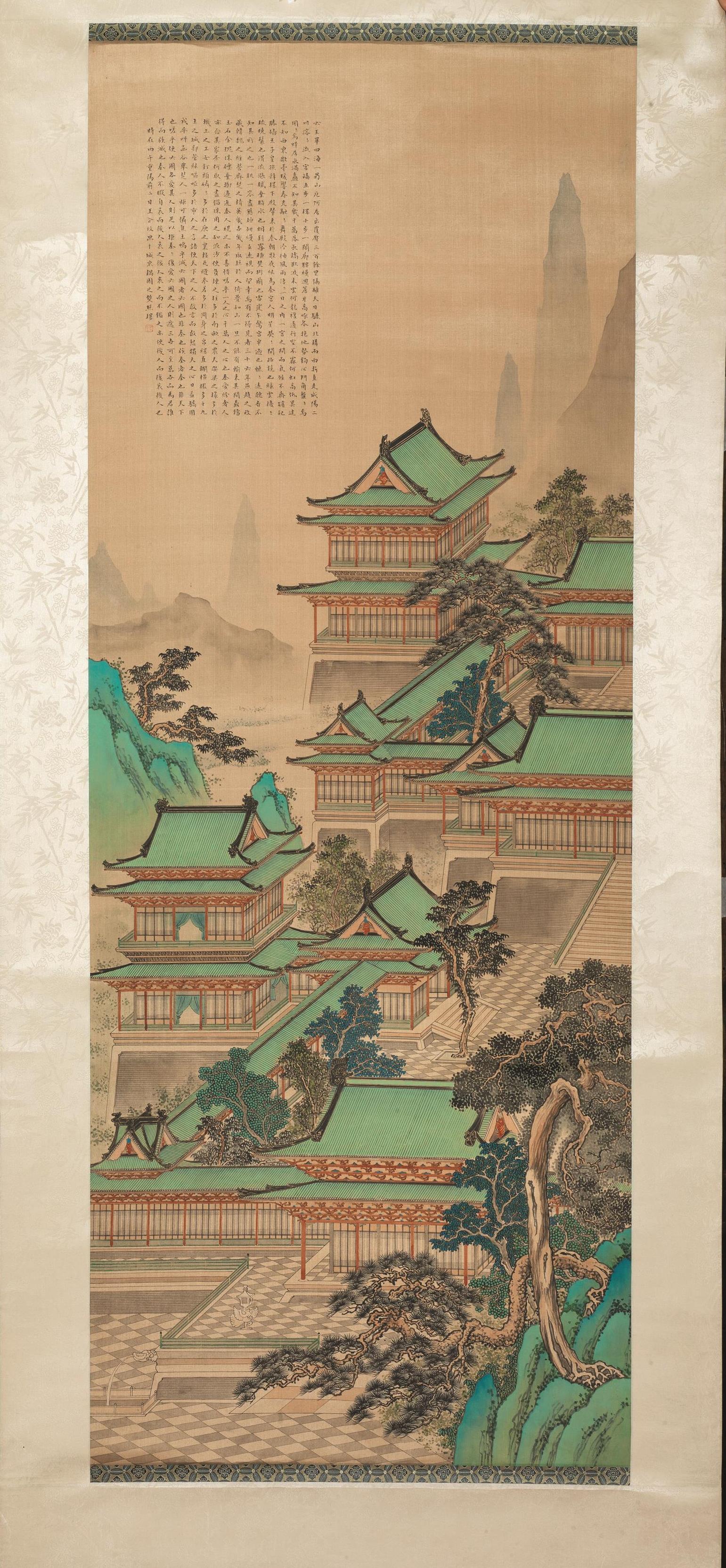 DIPINTO CINA SEC. XX su seta raffigurante palazzo, cm 115x44 A palace...