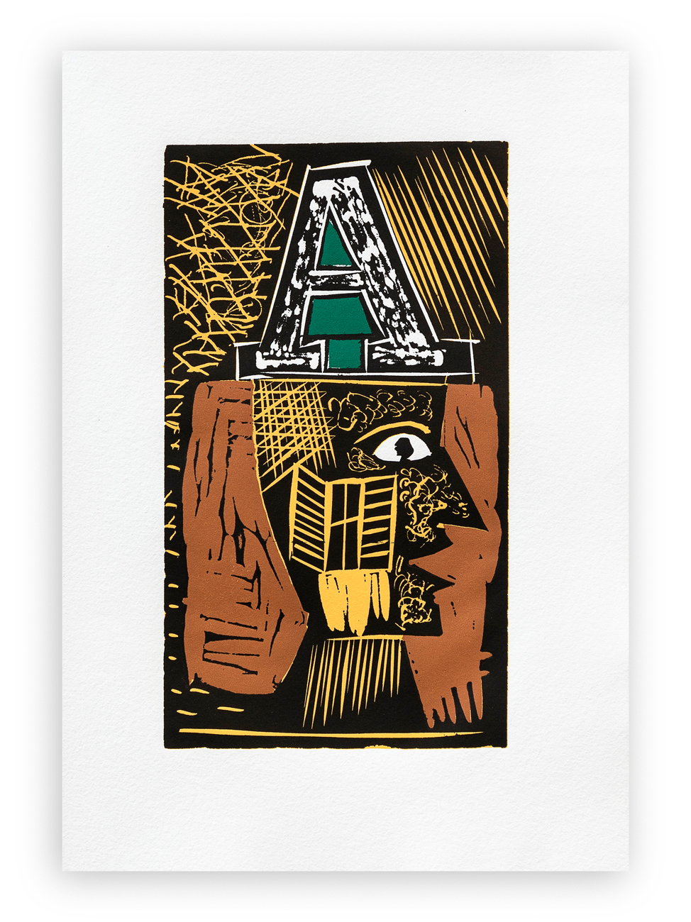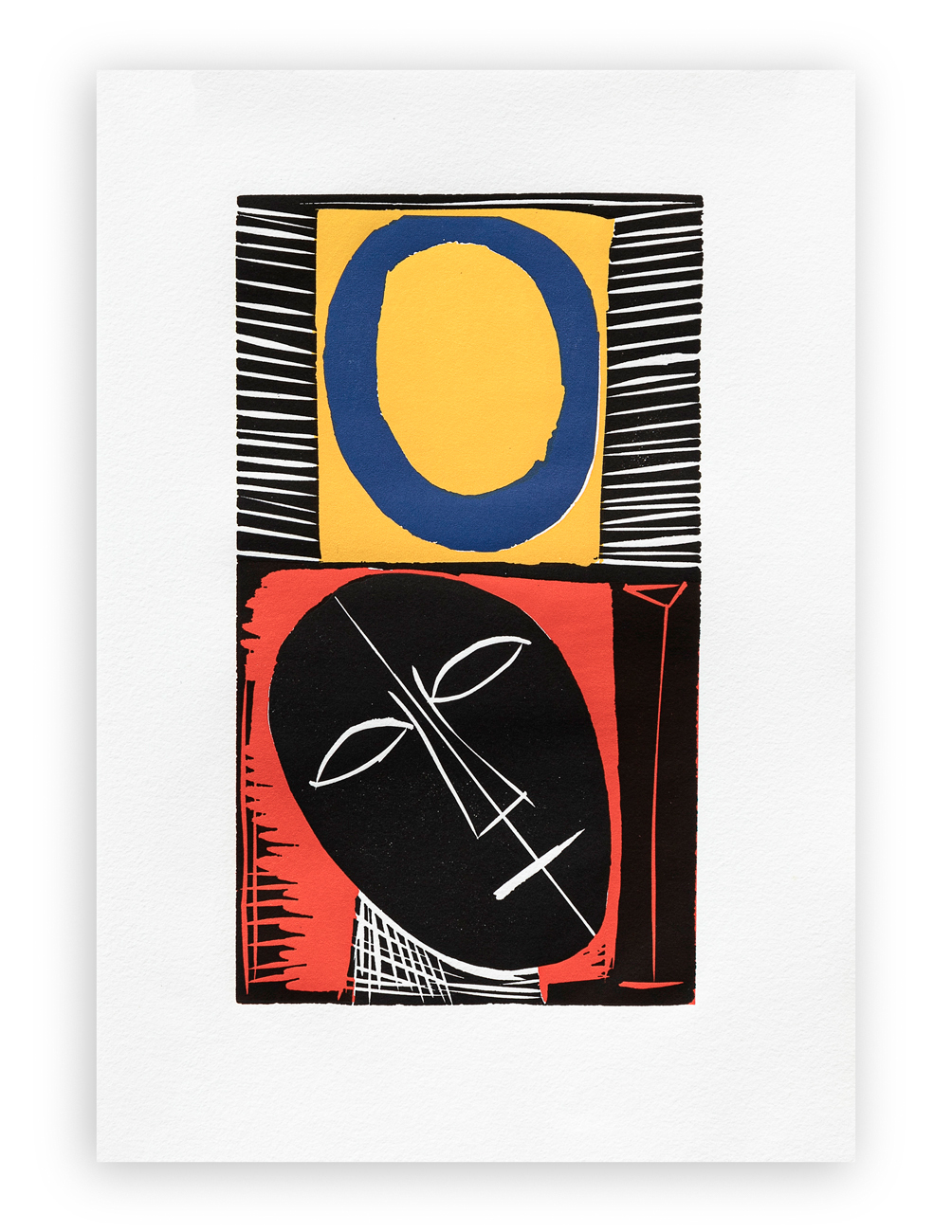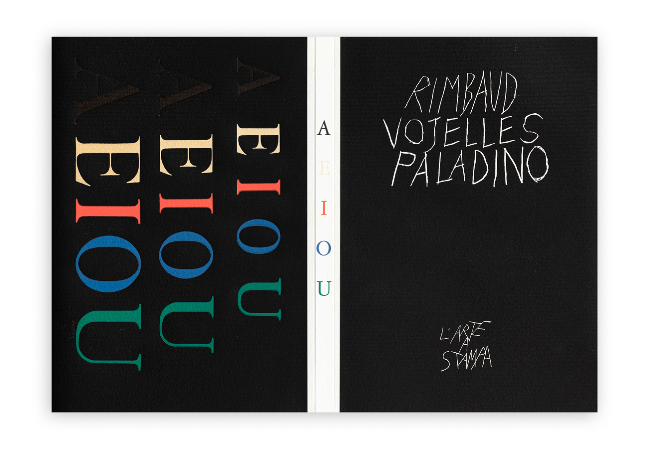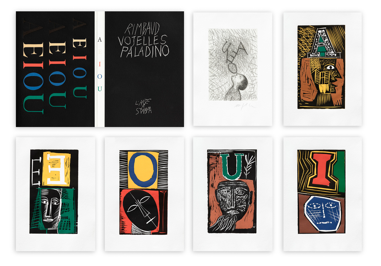 Edizione d'arte, realizzata su carta a mano della 'Cartiera di Sicilia', recante il sonetto 'Vojelle' di Arthur Rimbaud illustrato da 5 linoleum e un'acquaforte di Mimmo Paladino, quest'ultima recante firma a matita al fronte