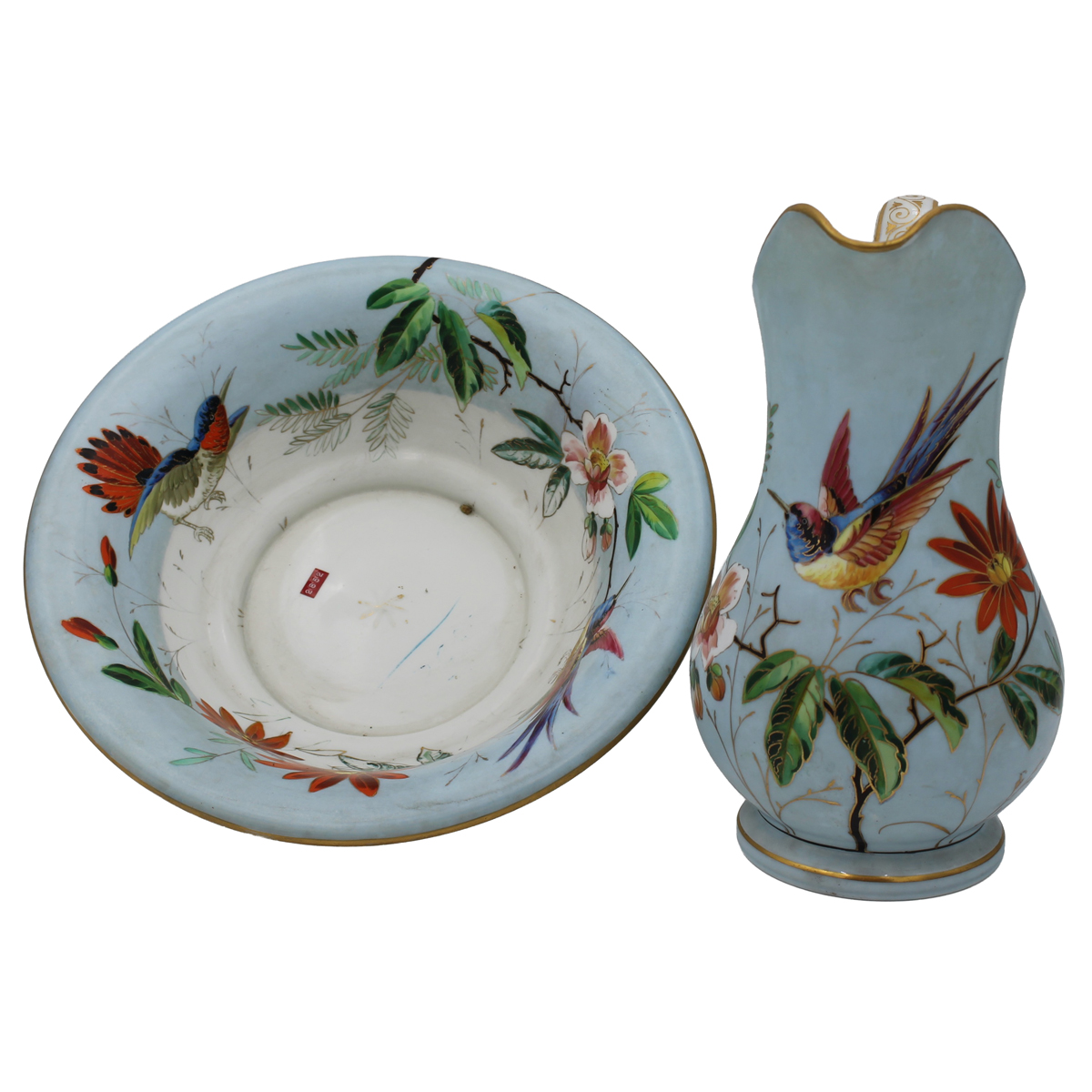Brocca e bacile Opaline con decoro a tutto tondo di volatili e motivi floreali policromi su fondo bianco. Francia. Fine secolo XIX. Cm h 32,5 (brocca); cm d 38 (bacile)
