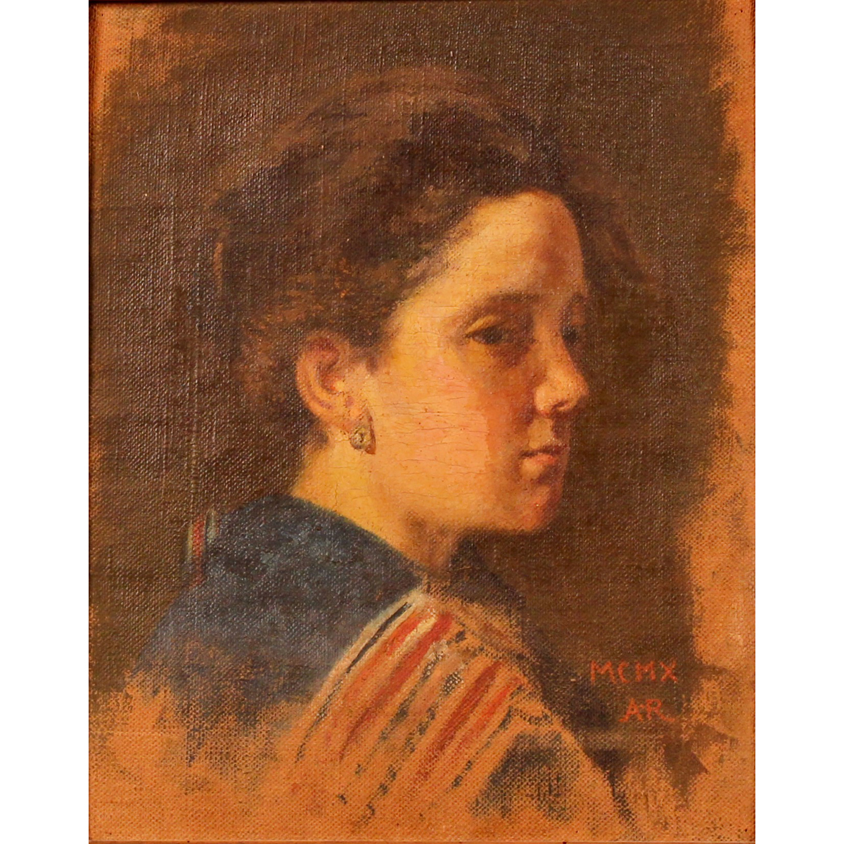 Antonio Rocchetti Torres (1851/1934) (attr.) "Profilo di ragazza" Dipinto ad olio su tela in cornice in legno (restauri). Siglato A.R. Firmato sul retro. Cm 41x33