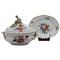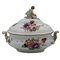 Grande zuppiera con vassoio Antica porcella decorata a motivi floreali policromi con putto nella parte superiore. Meissen. Secolo XIX. Cm h 30