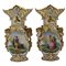 Coppia di grandi vasi Antica porcellana con decoro frontale raffigurante popolani policromi e decoro vegetale a rilievo dorato. Francia. Epoca. Luigi Filippo.. Cm h 40