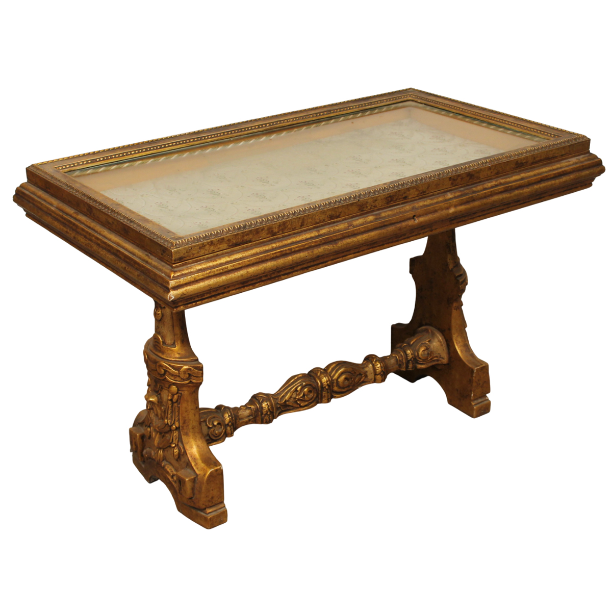 Tavolino a bacheca Legno dorato con piede scolpito a motivi ornamentali. Sicilia. Secolo XX. Cm 94x54 h 60