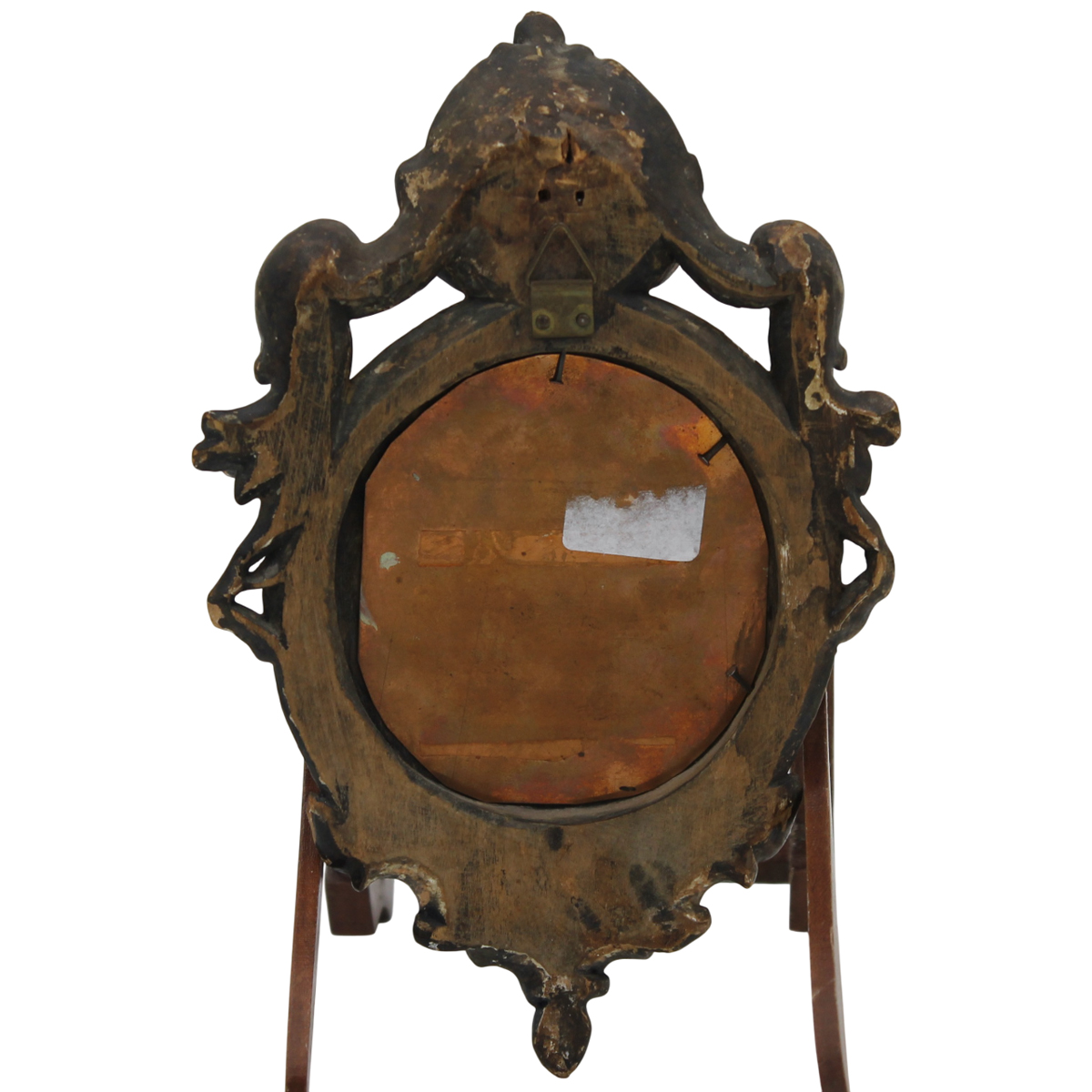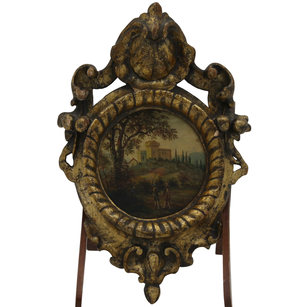 Artista italiano del secolo XX "Paesaggio con castello" Piccola miniatura su rame in cornice in legno scolpito e dorato. Cm 9x8