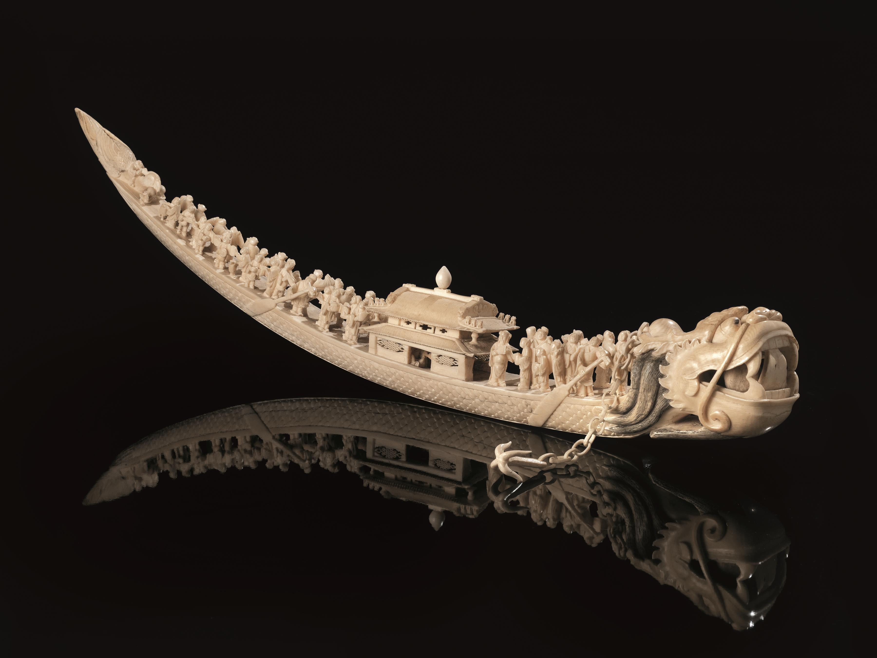 in avorio della manifattura di Canton, intagliata a forma di barca con la prua modellata a testa di drago, lung. cm 63