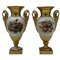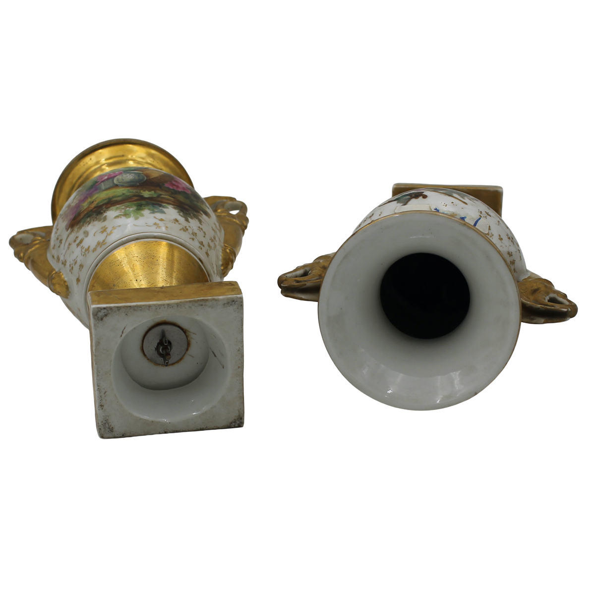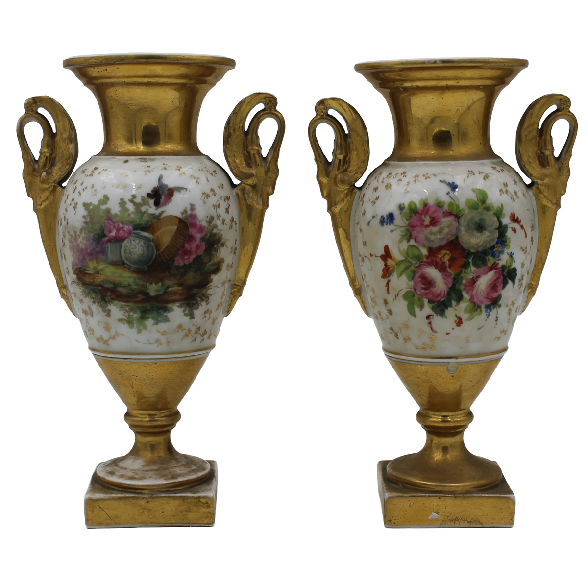 Coppia vasi Antica porcellana con decoro frontale raffigurante paesaggi con volatili e sul retro decoro a motivi floreali policromi e ornamentali dorati (lievi sbeccature). Francia. Inizi secolo XIX. Cm h 28,5