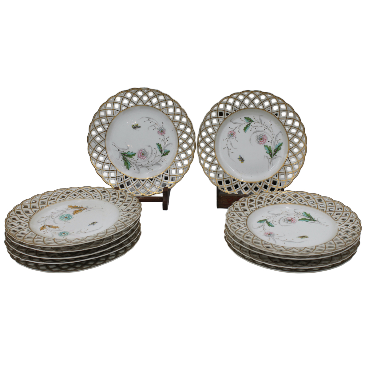 Lotto di undici piatti Porcellana policroma con decoro a motivi floreali. Secolo XX. Cm d 22