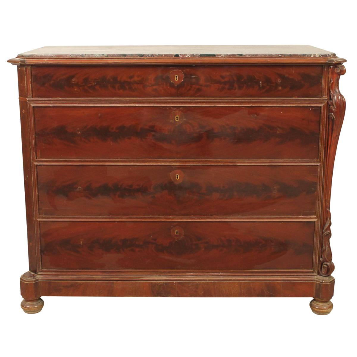 Cassettone a quattro cassetti Piuma di mogano con piano in marmo rosso venato (mancante di un intaglio laterale). Italia settentrionale. Fine secolo XIX. Cm 124x59,5 h 101