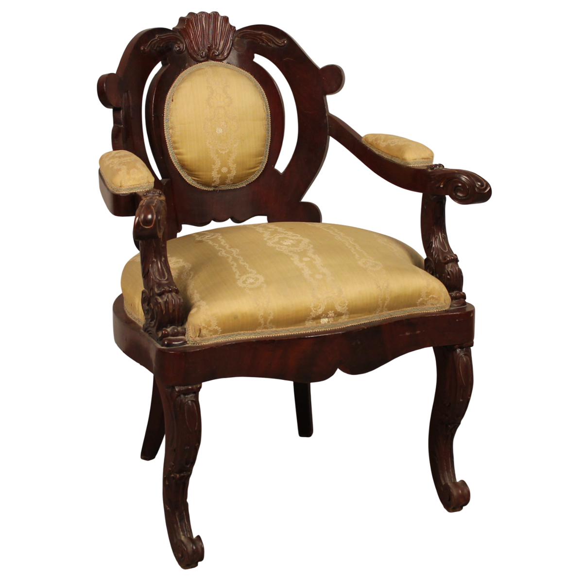 Poltrona Mogano scolpito a motivi ornamentali sui braccioli e sulla spalliera. Sicilia. Secolo XIX. Cm 52x64 h 88