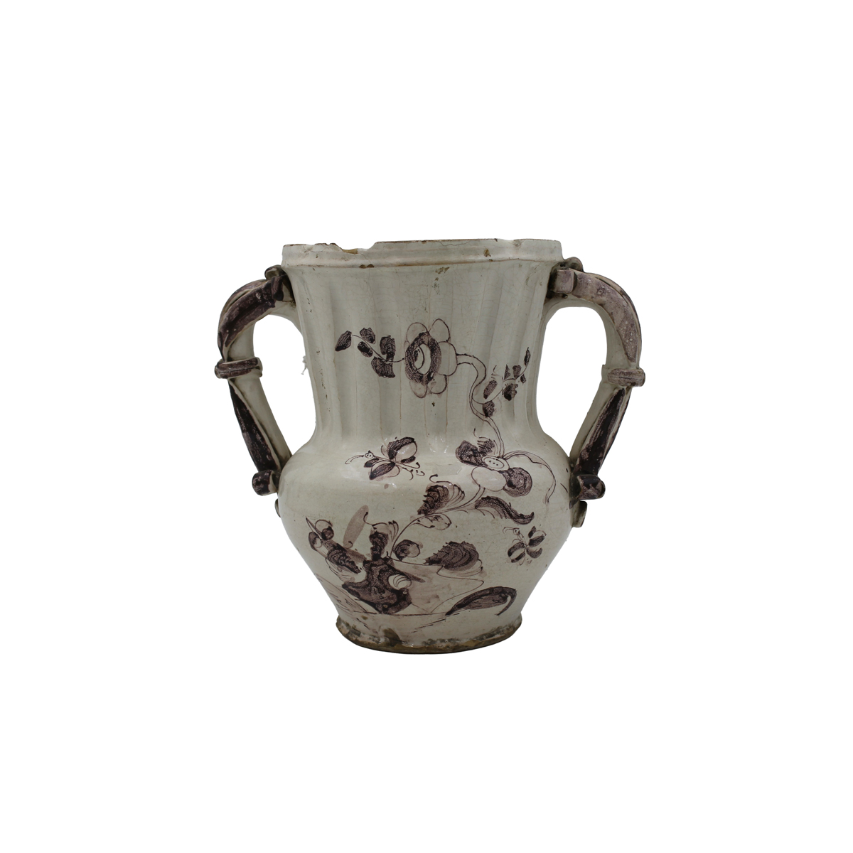 Anfora a due manici Antica maiolica decorata a motivi floreali e vegetali policromi su fondo crema (sbeccature). Fine secolo XVIII. Cm h 27,5