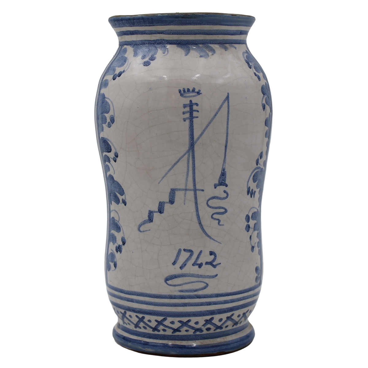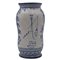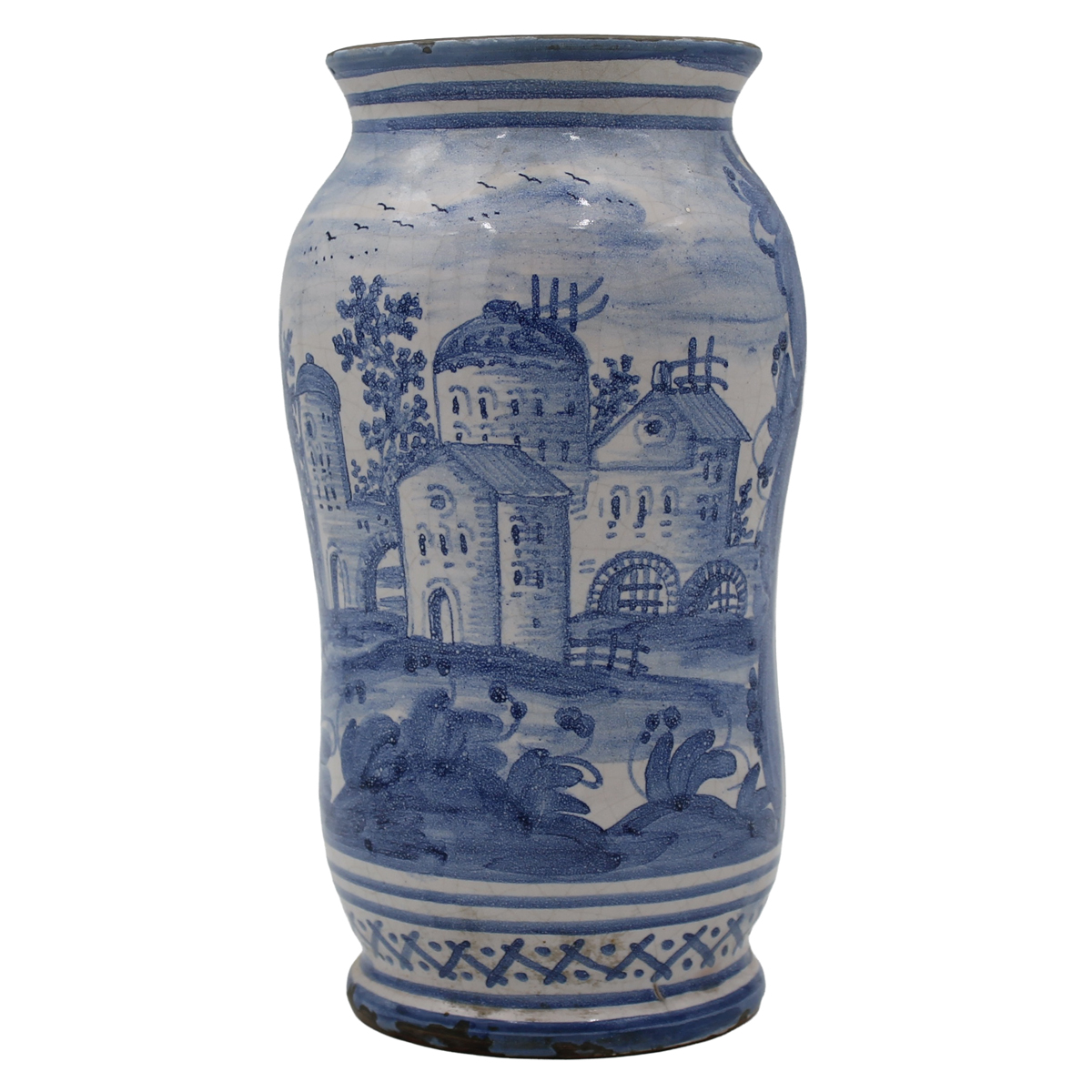 Vaso Maiolica decorata con paesaggio e casolari in celeste su fondo crema. Abruzzi. Cm h 25