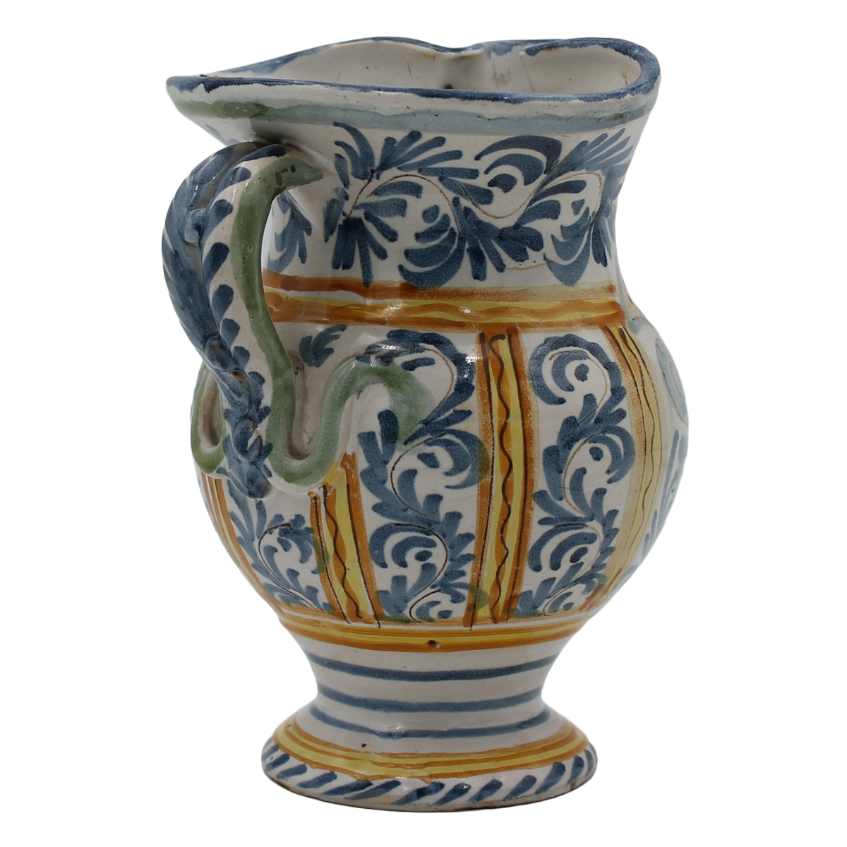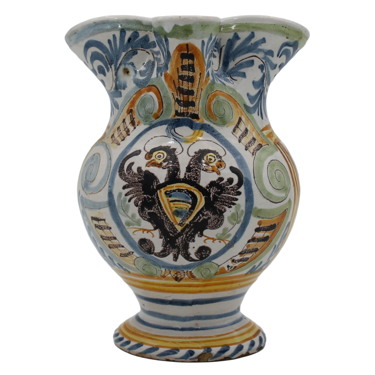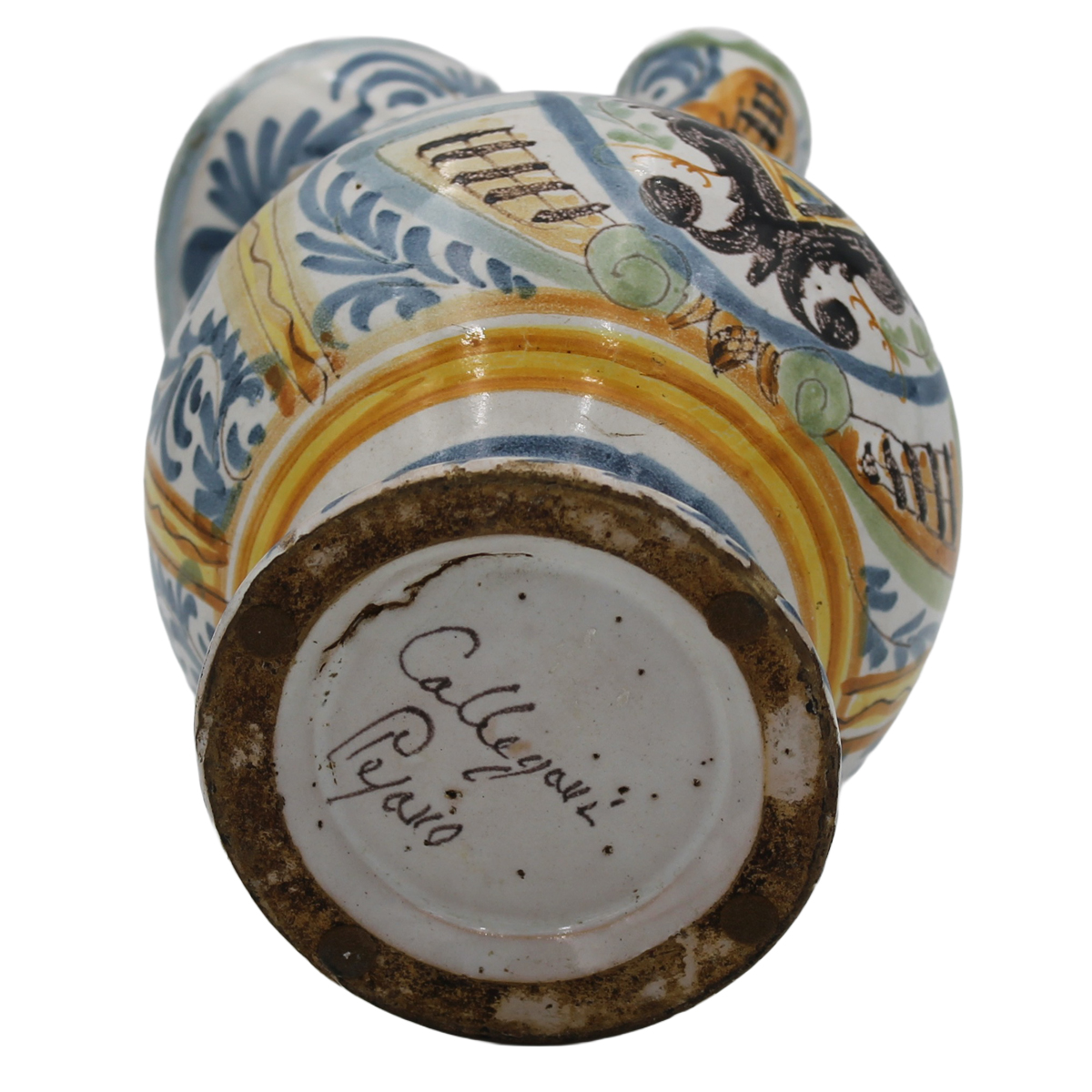 Brocca Maiolica policroma con stemma gentilizio nella parte centrale e motivi ornamentali policromi (sbeccatura al collo). Pesaro. Seconda metà del secolo XIX. Cm h 21