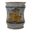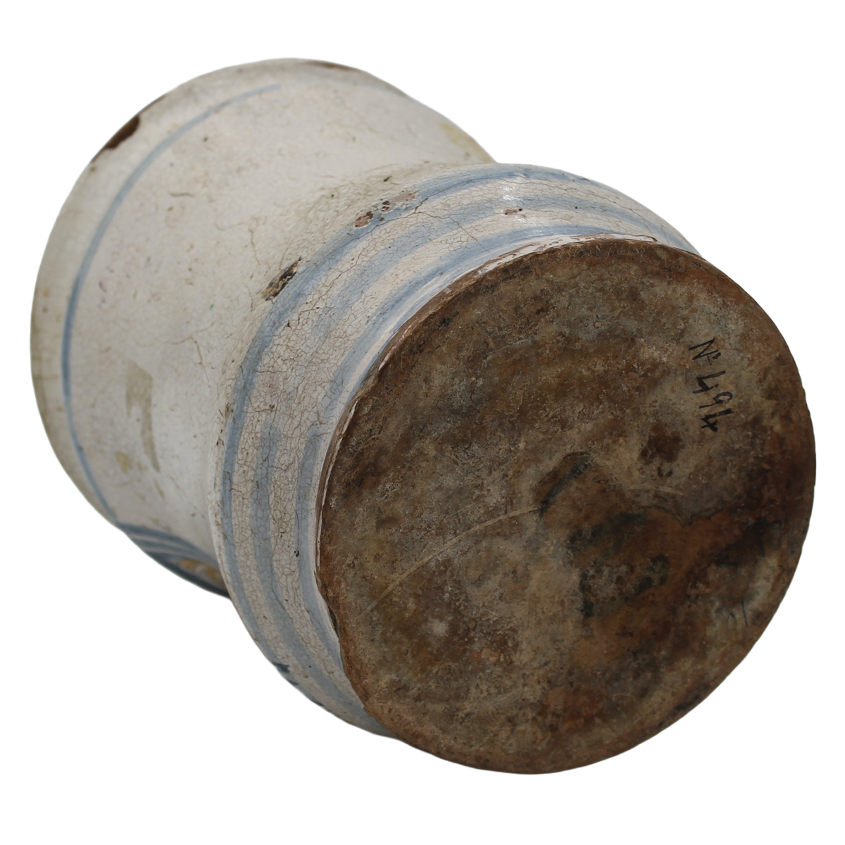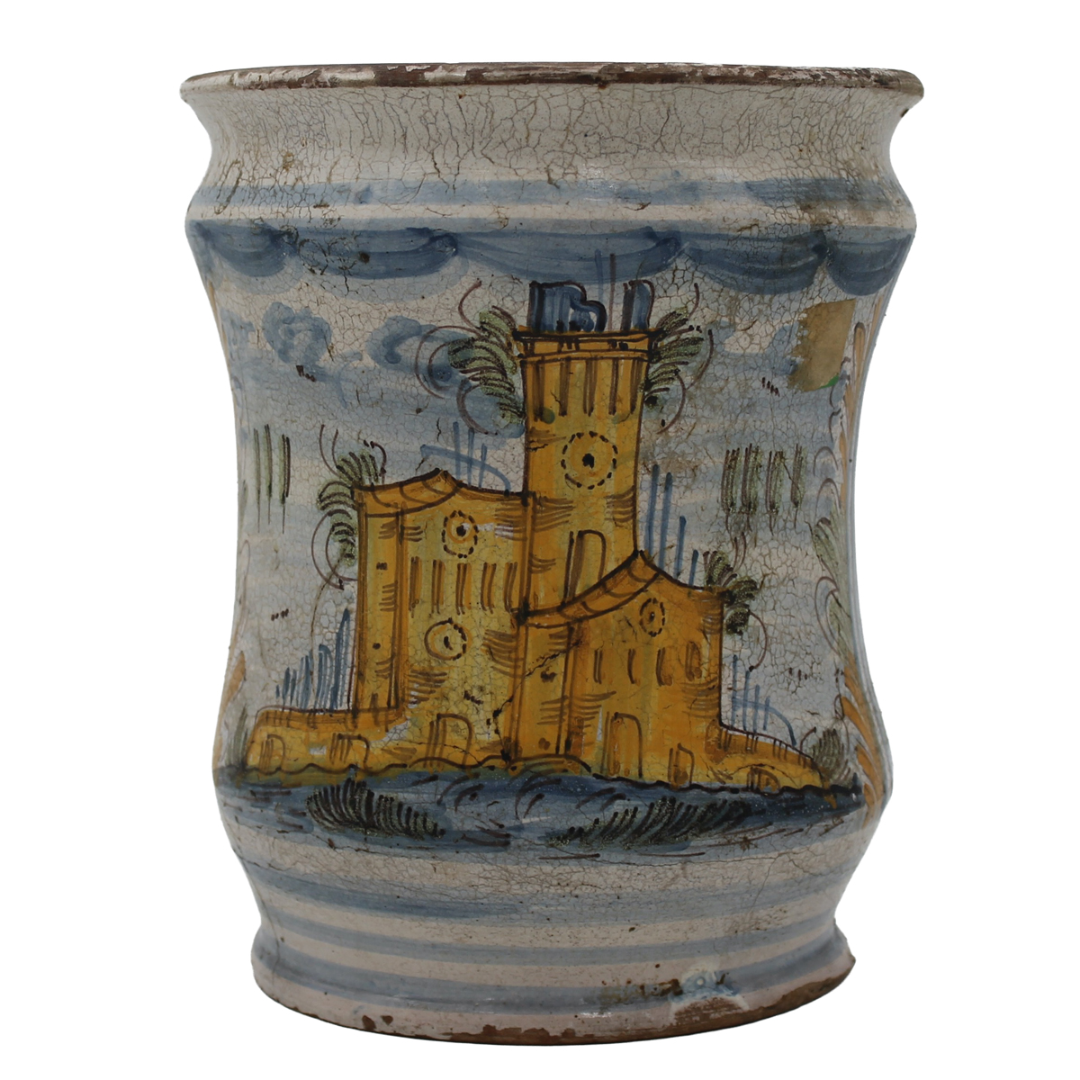 Grande cilindro Antica maiolica con decoro frontale policromo raffigurante paesaggio con castello su fondo bianco (failure alla base). Napoli. Secolo XIX. Cm h 23
