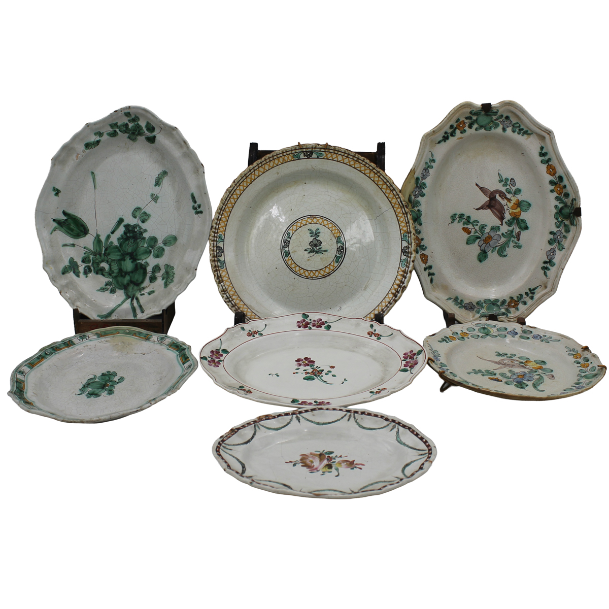 Sette vassoi e piatti Antica maiolica con decoro vegetale e floreale policromo su fondo bianco (lievi restauri su alcuni piatti). Campania. Secolo XVIII e XIX