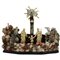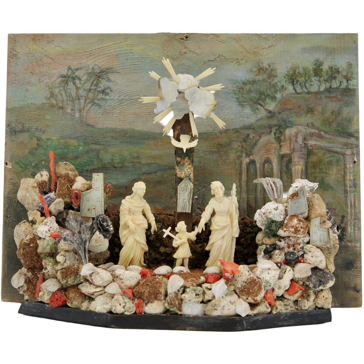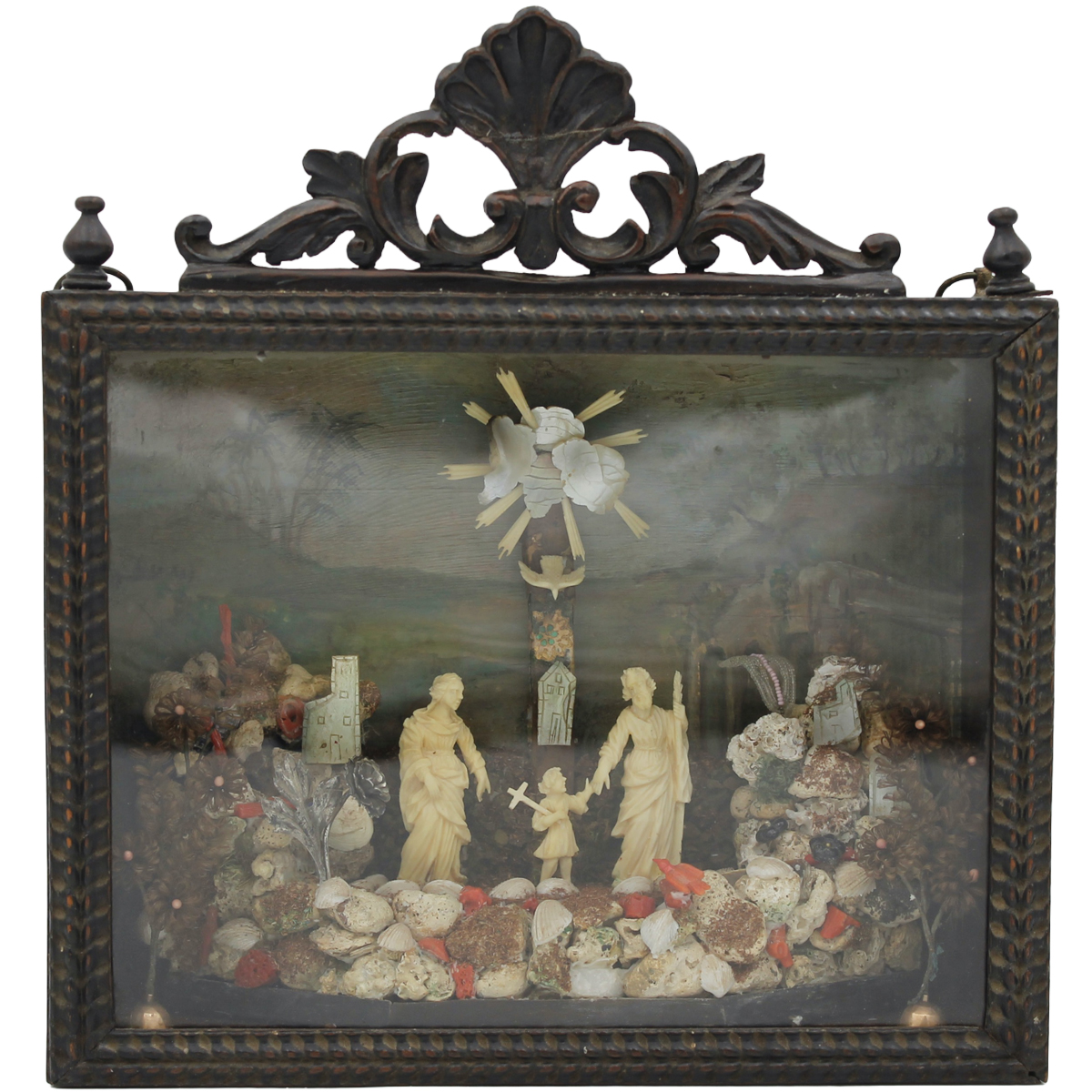 Maestro trapanese del secolo XVIII "Sacra famiglia" Composizione in avorio, madreperla, corallo, conchiglie inserita in bacheca in legno scolpito con fondo dipinto raffigurante paesaggio con architetture. Lotto dotato di certificazione Cites. Cm 28x26,5