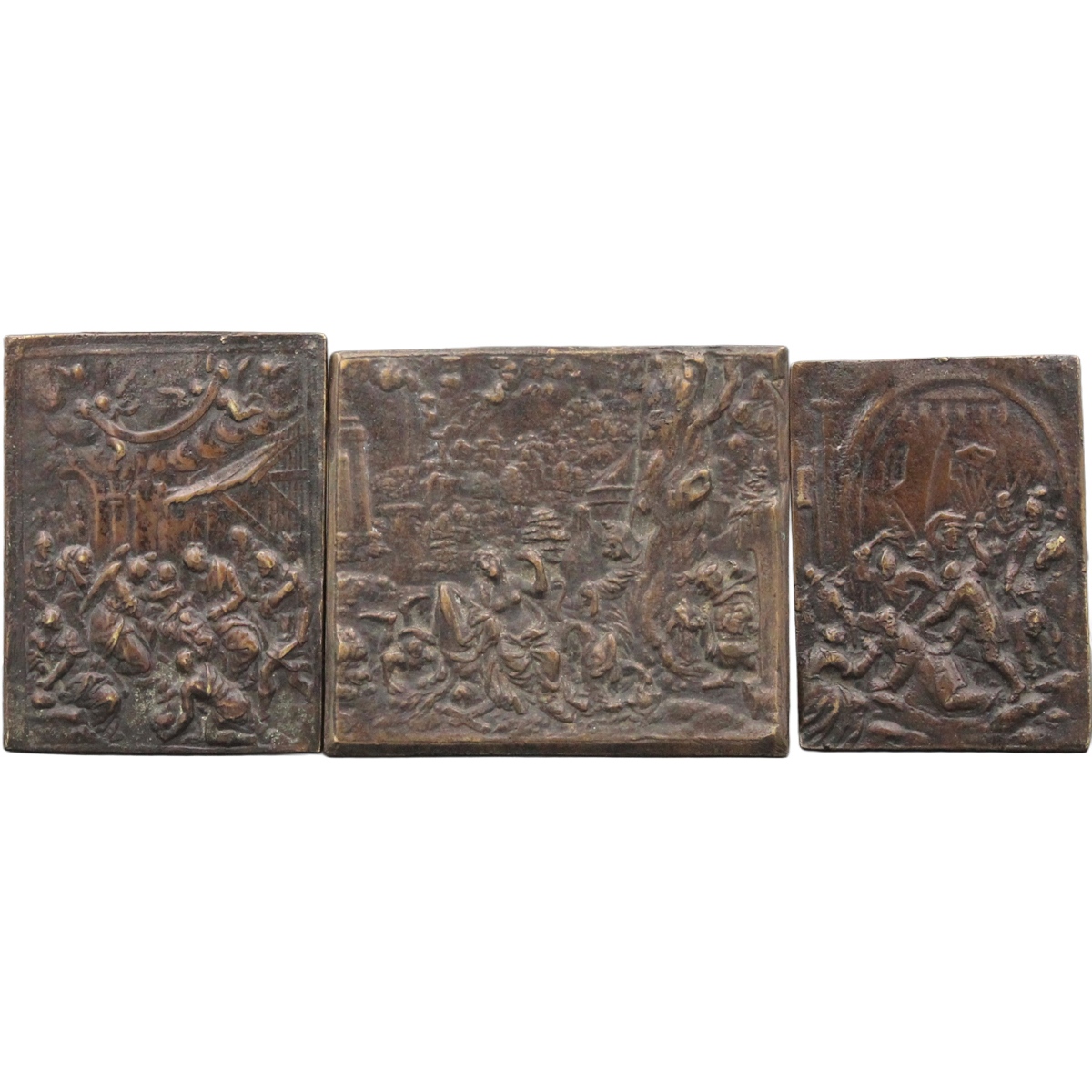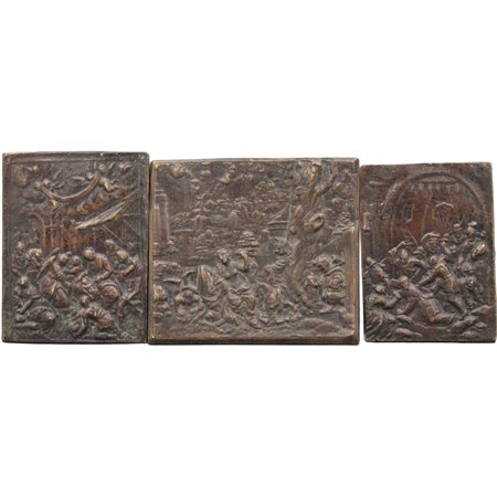 Artista tedesco del secolo XVI "Scene sacre" Tre placche in bronzo finemente inciso. Cm 9,5x11 (la maggiore)