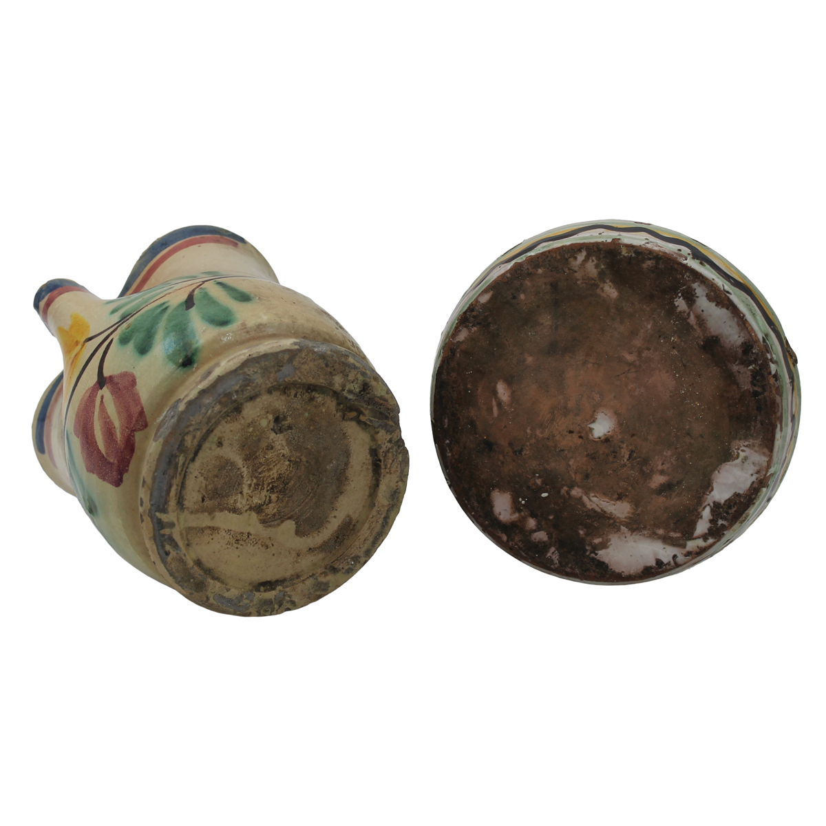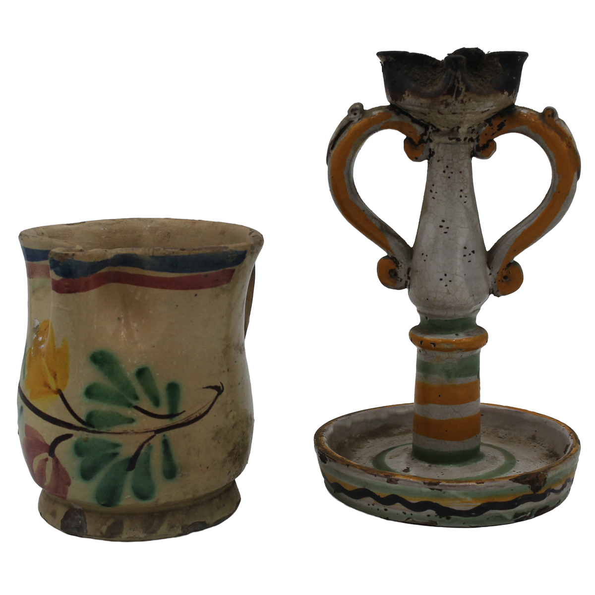 Cannata e lucerna Antica maiolica con decoro a motivi ornamentali e vegetali policromi. Italia meridionale. Secolo XIX. Cm h 15 (cannata); cm h 24 (lucerna)