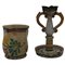 Cannata e lucerna Antica maiolica con decoro a motivi ornamentali e vegetali policromi. Italia meridionale. Secolo XIX. Cm h 15 (cannata); cm h 24 (lucerna)