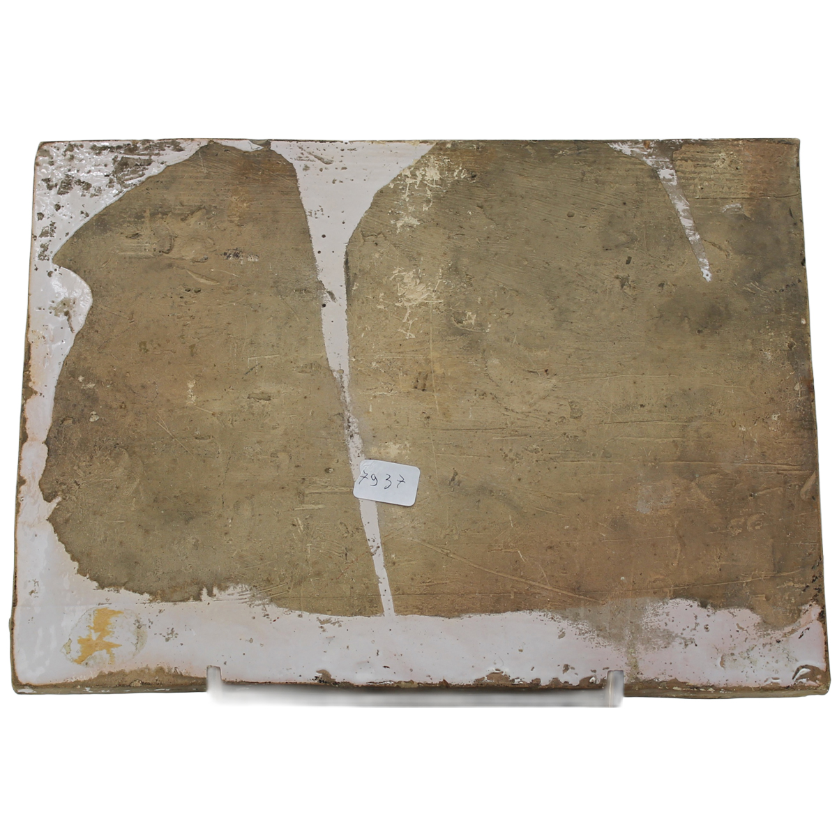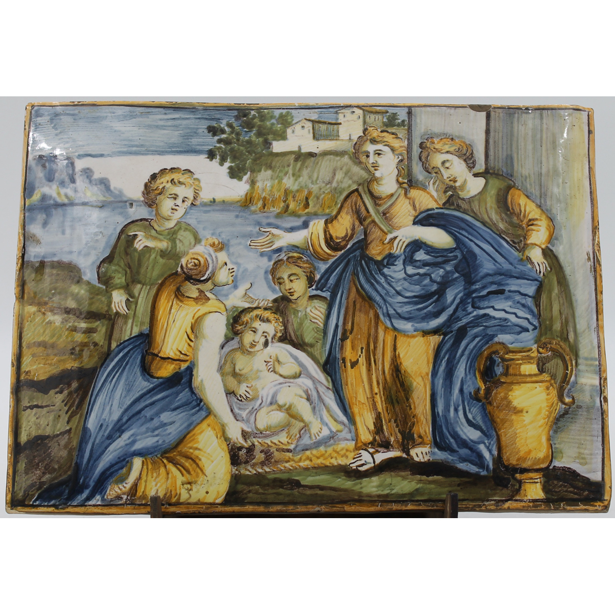 Mattonella Antica maiolica con decoro frontale raffigurante Mosè salvato dalle acque. Castelli. Secolo XVIII. Cm 27,5x20