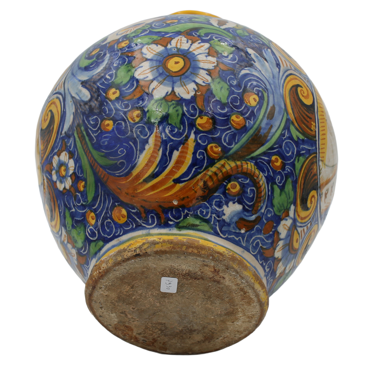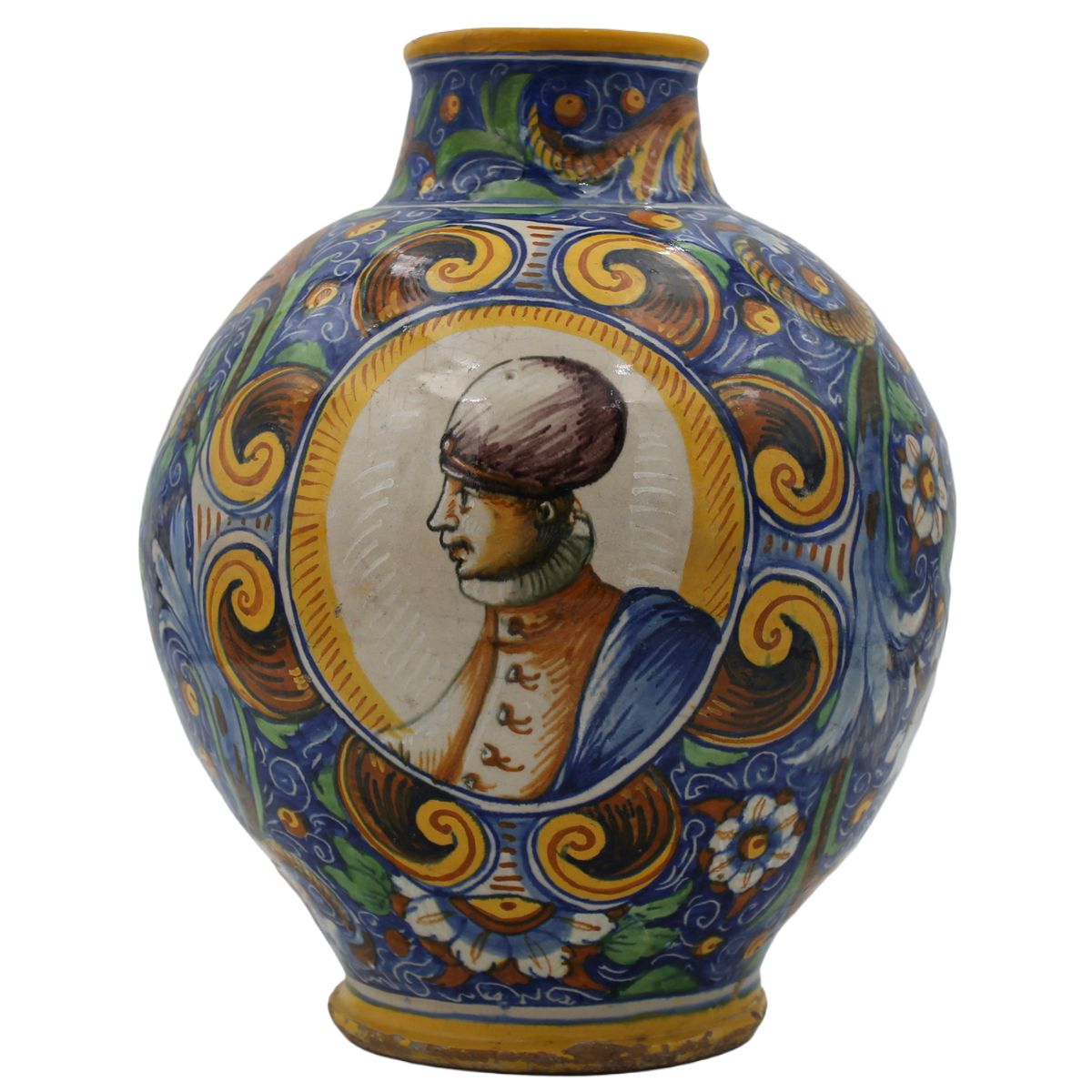 Grande vaso ovoidale Antica maiolica con decoro a doppio medaglione raffiguranti profili maschili e ricco decoro a motivi floreali e vegetali policromi (importanti restauri sul collo e danni nel corpo della maiolica). Venezia. Seconda metà del secolo XVI. Cm h 39