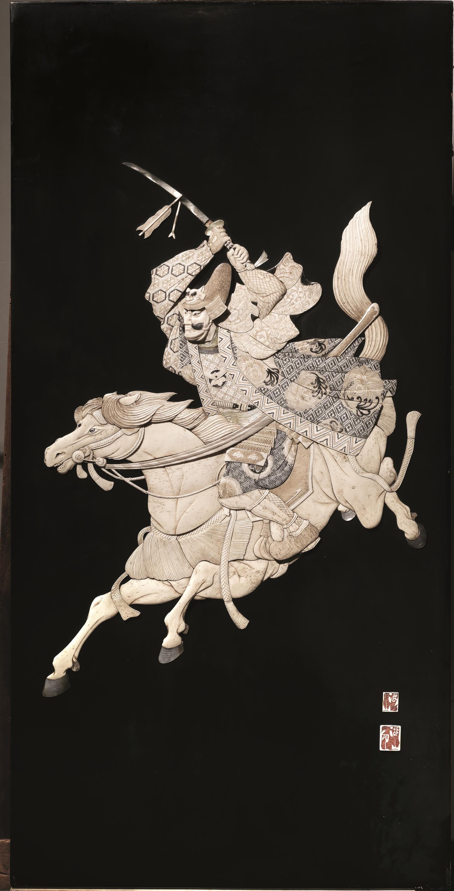 in legno laccato decorato con samurai a cavallo in avorio cm 106x53