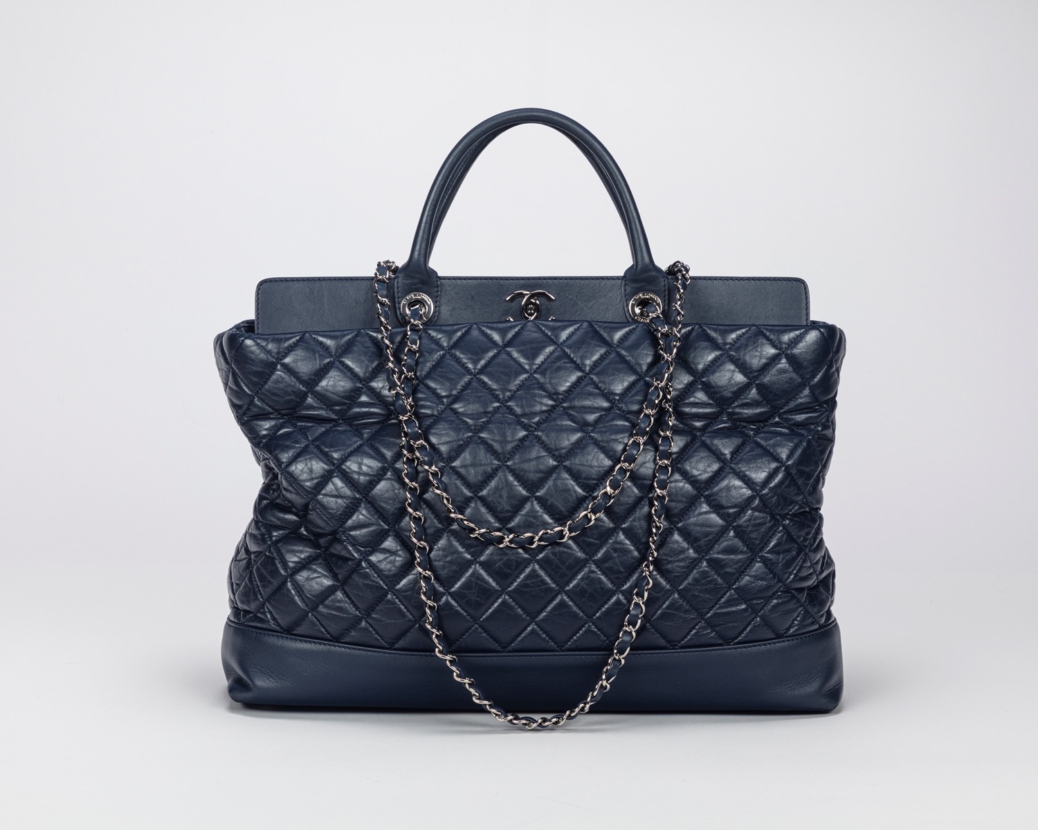 in pelle matelassé color blu, doppi manici e tracolle a catena staccabili, dettagli in metallo, cm 40, con sacchetto (lievi segni d'uso)in pelle matelassé color blu, doppi manici e tracolle a catena staccabili, dettagli in metallo, cm 40, con sacchetto (lievi segni d'uso)