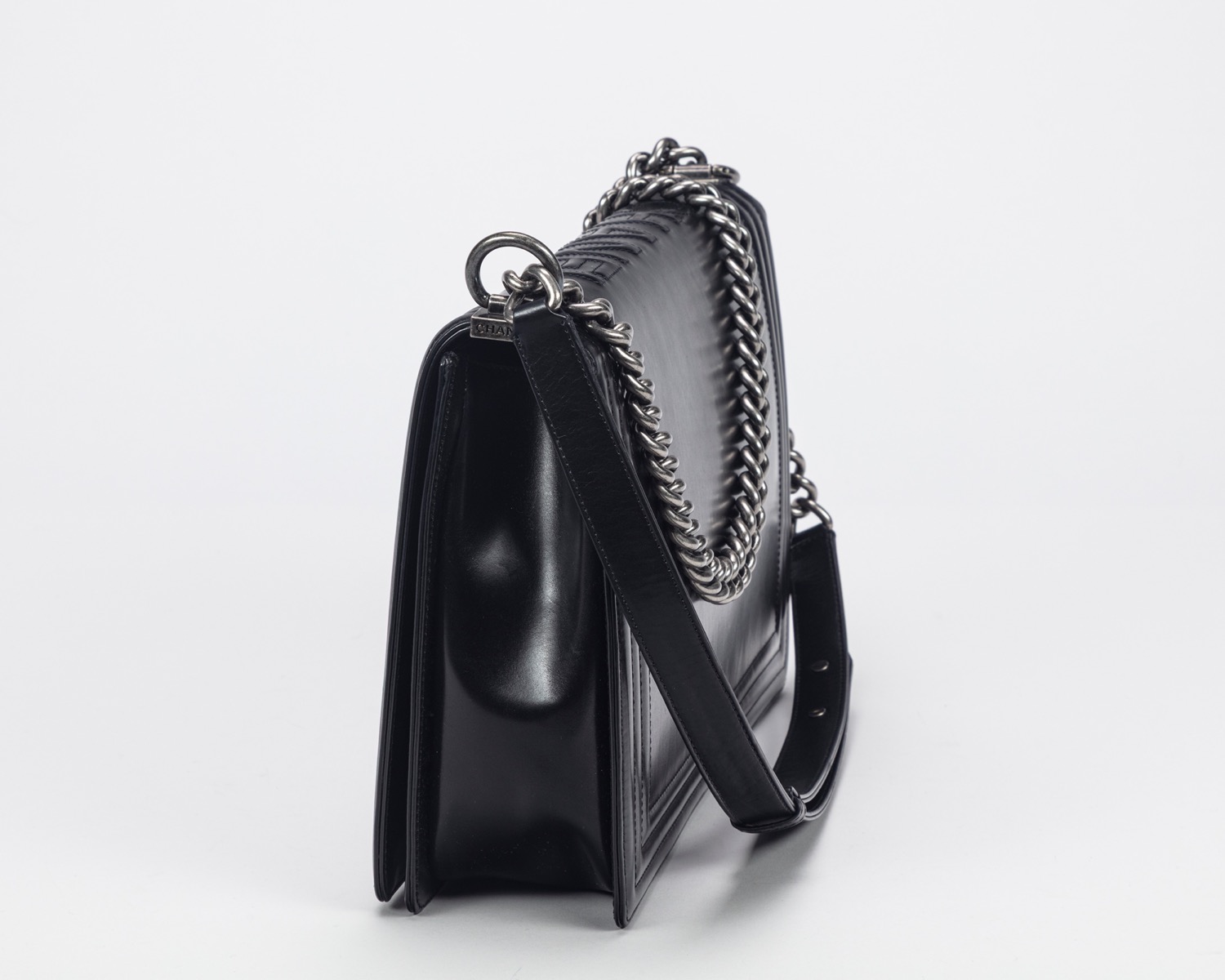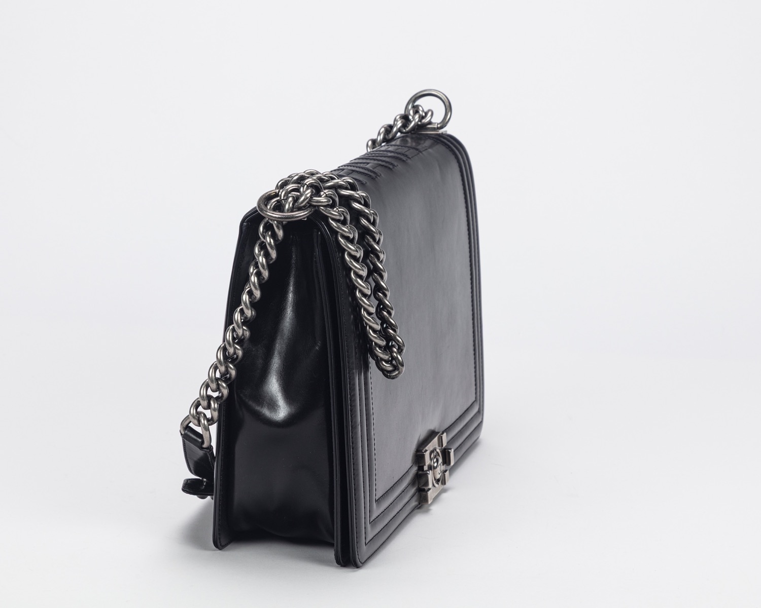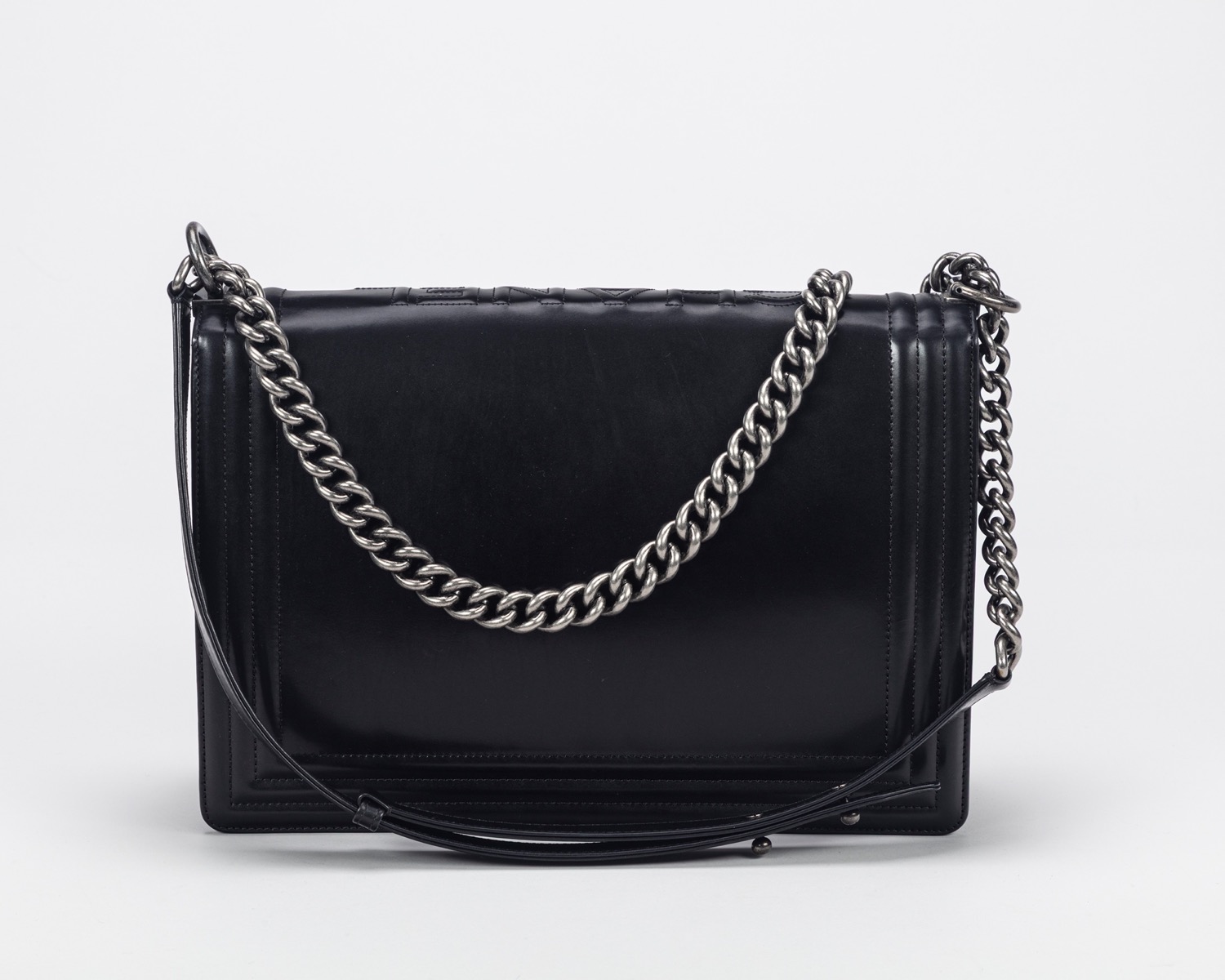 in pelle color nero, tracolla a catena regolabile in metallo, dettagli in metallo brunito, cm 30 (lievissimi segni d'uso)in pelle color nero, tracolla a catena regolabile in metallo, dettagli in metallo brunito, cm 30 (lievissimi segni d'uso)