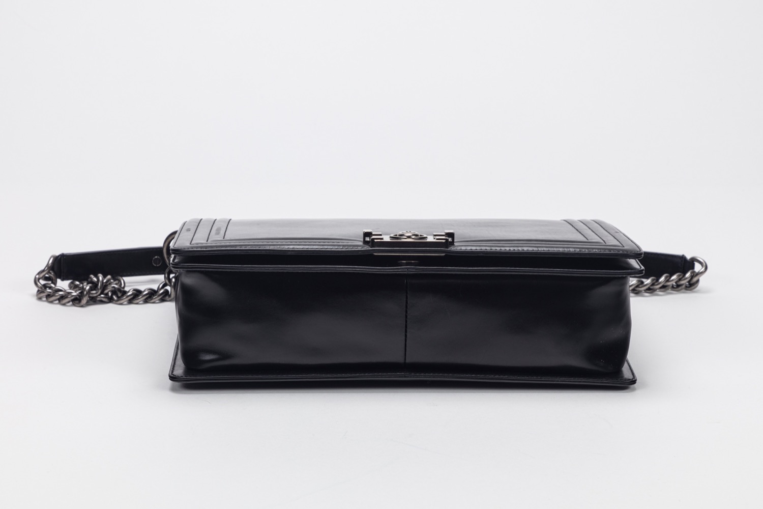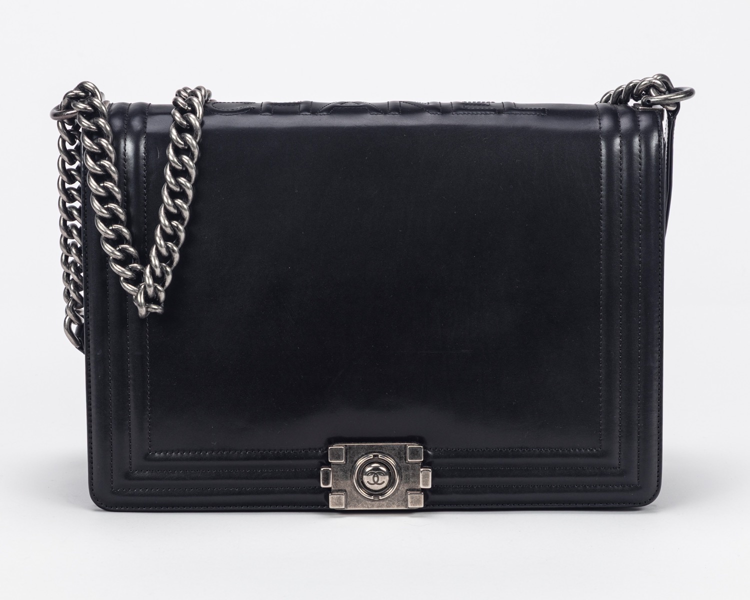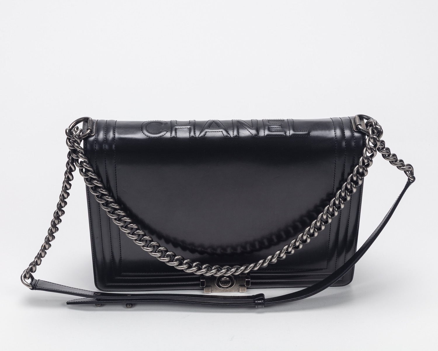 in pelle color nero, tracolla a catena regolabile in metallo, dettagli in metallo brunito, cm 30 (lievissimi segni d'uso)in pelle color nero, tracolla a catena regolabile in metallo, dettagli in metallo brunito, cm 30 (lievissimi segni d'uso)