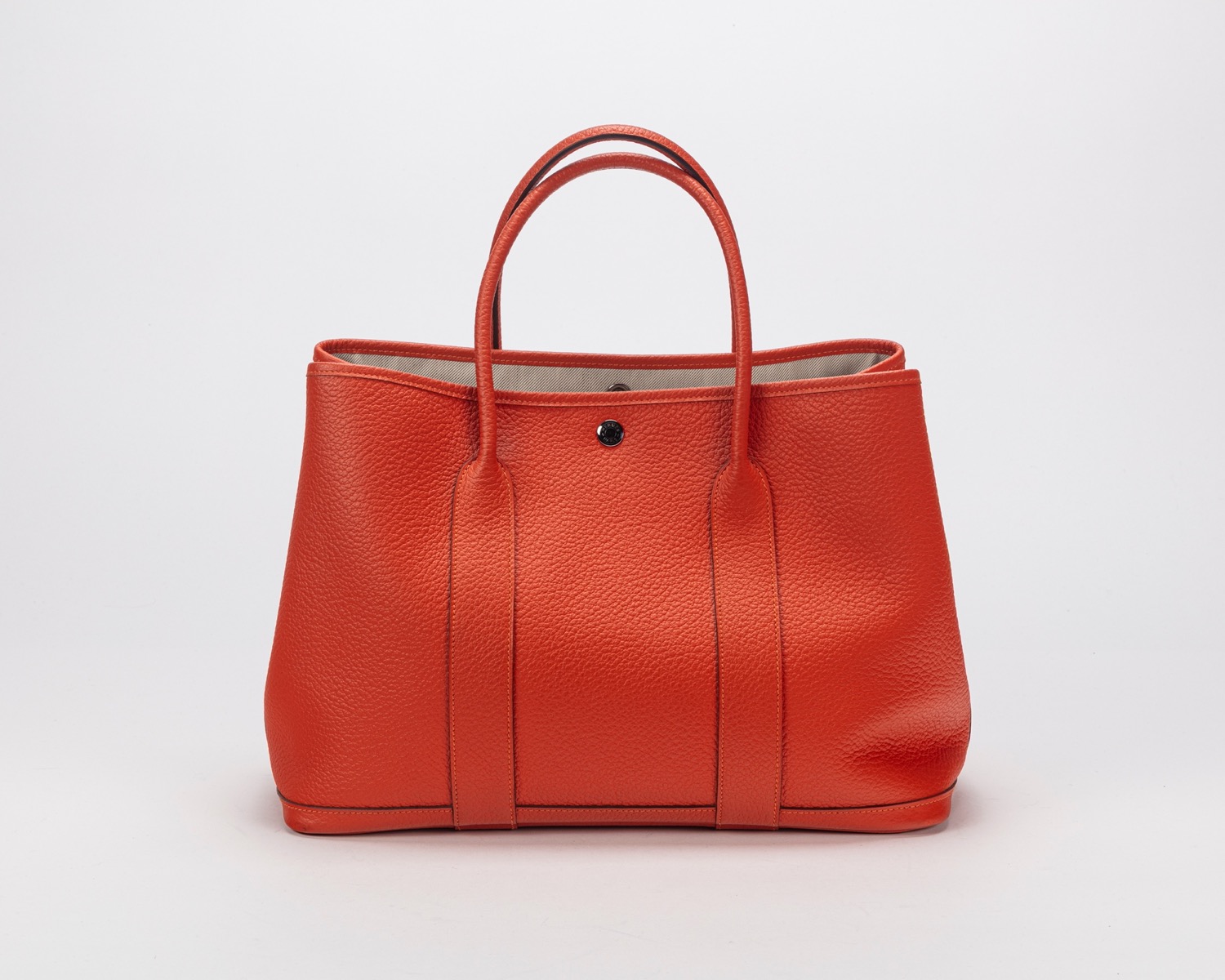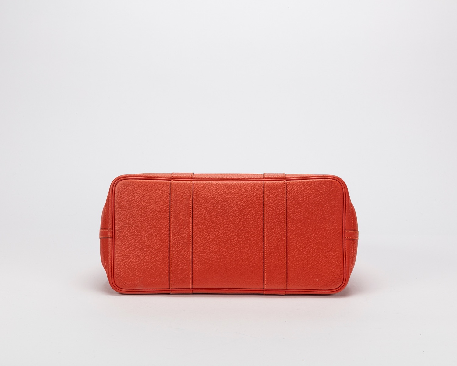 in pelle clémence color arancio, interno in tela stampa Quadrige, dettagli in palladio, cm 36, con sacchetto (lievissimi segni d'uso)in pelle clémence color arancio, interno in tela stampa Quadrige, dettagli in palladio, cm 36, con sacchetto (lievissimi segni d'uso)