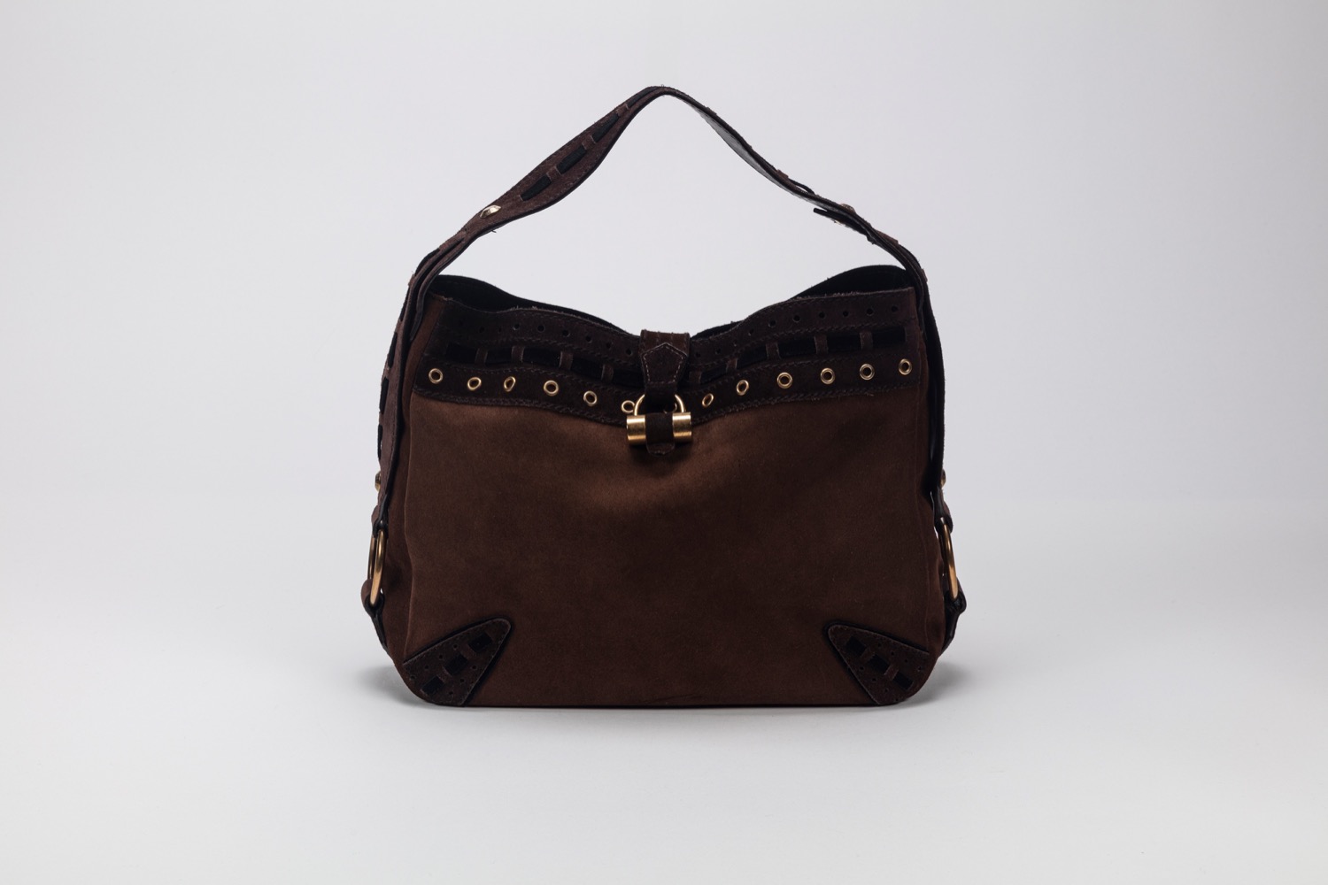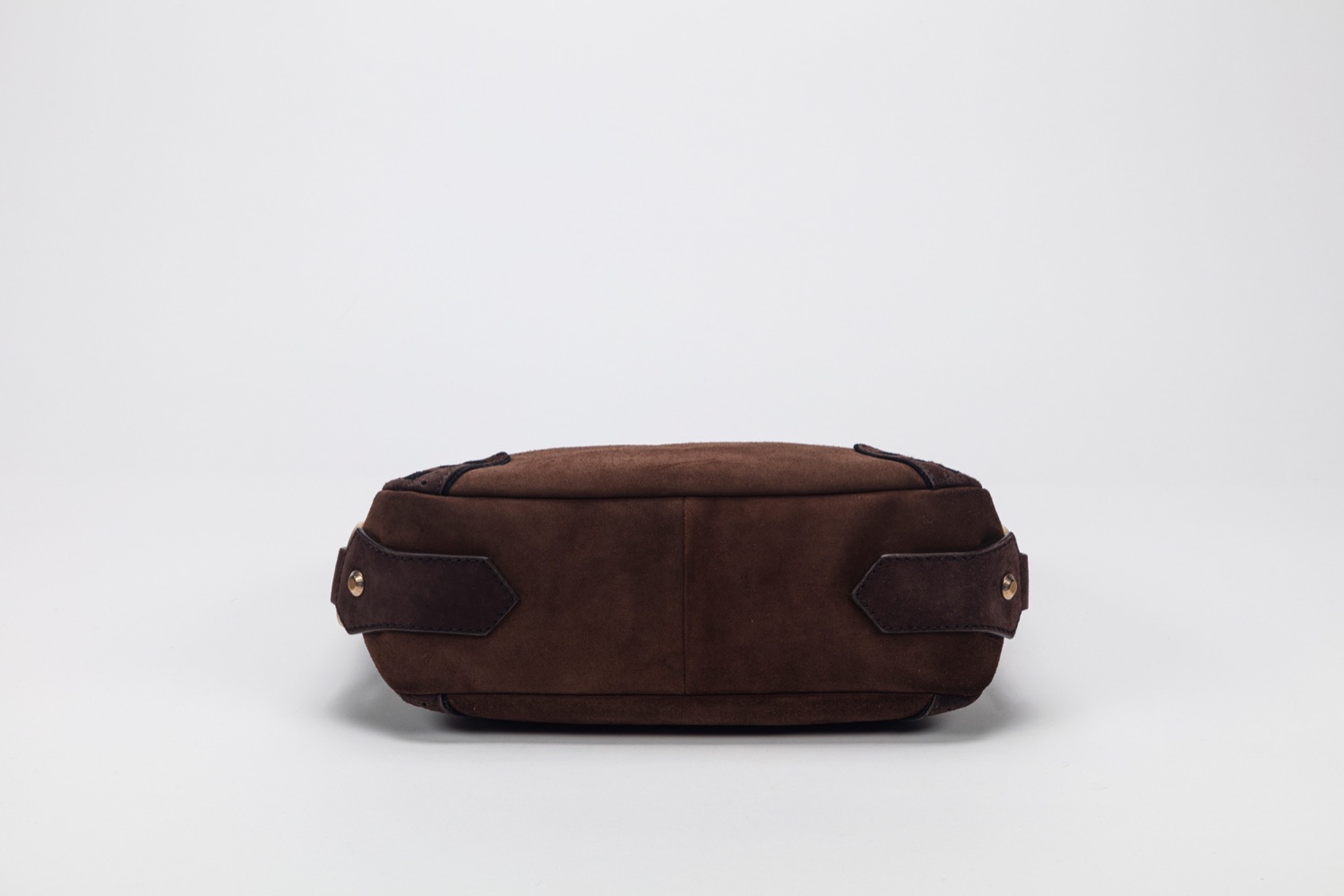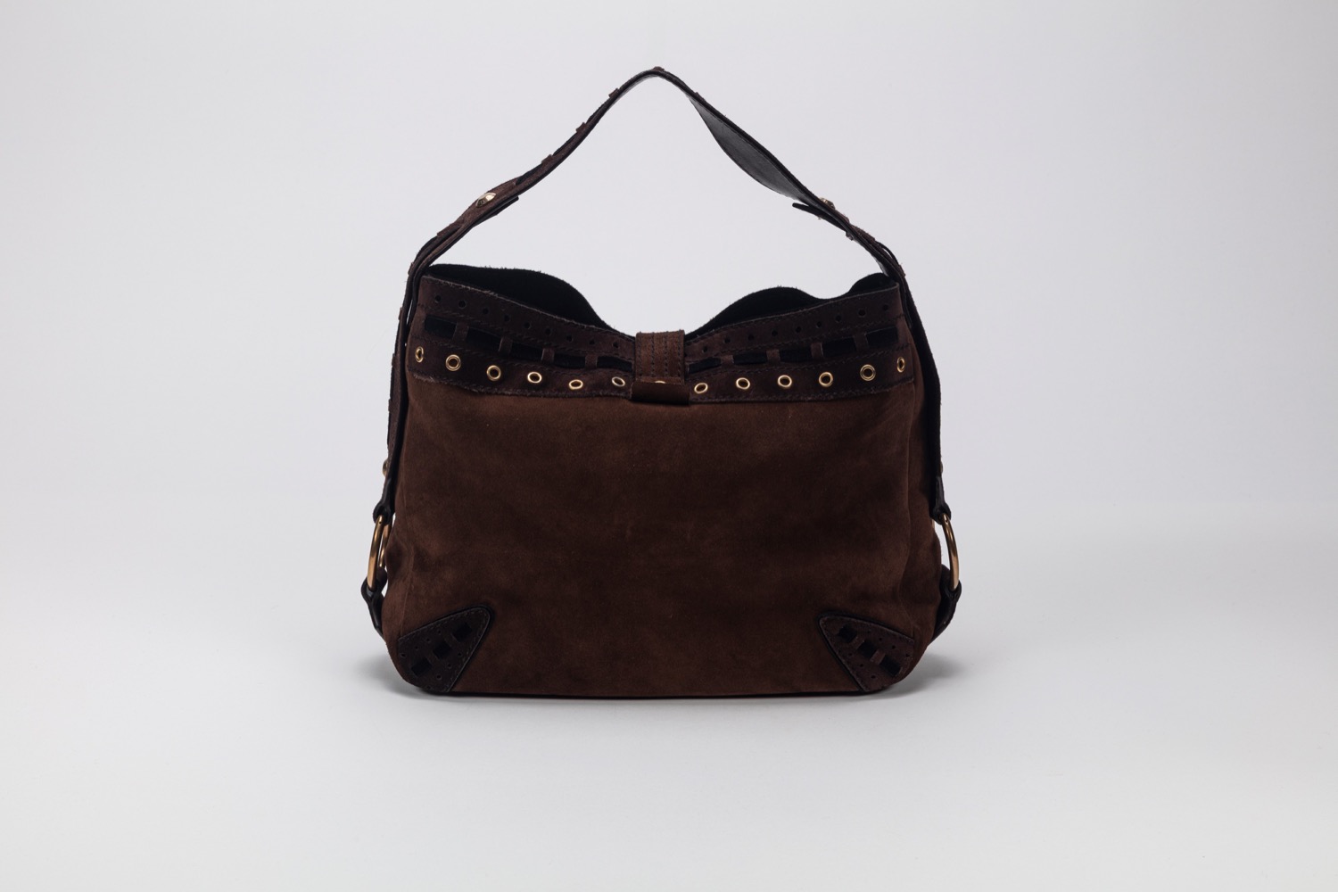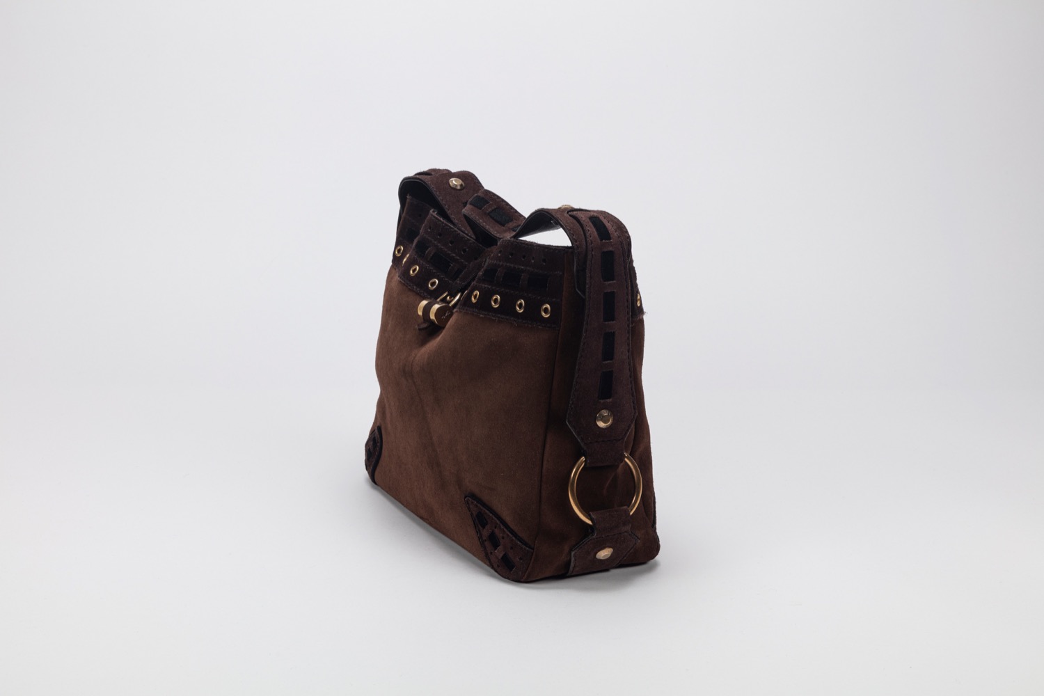 in camoscio color marrone e nero, dettagli in metallo dorato, cm 30, con sacchetto (lievi segni d'uso)in camoscio color marrone e nero, dettagli in metallo dorato, cm 30, con sacchetto (lievi segni d'uso)