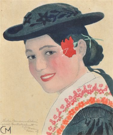 Carl Moser (Bozen/Bolzano 1873 - 1939) Contadinella tirolese, 1907;Xilografia a colori, 27,5 x 23 cm, in cornice