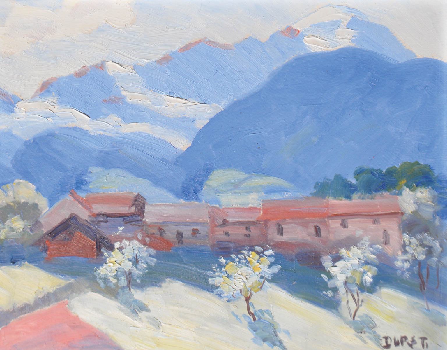 Josef Durst (Wien/Vienna 1878 - Brixen/Bressanone 1950) Paesaggio primaverile presso Bressanone, 1920 ca.;Olio su cartone, 32,5 x 41 cm, in cornice