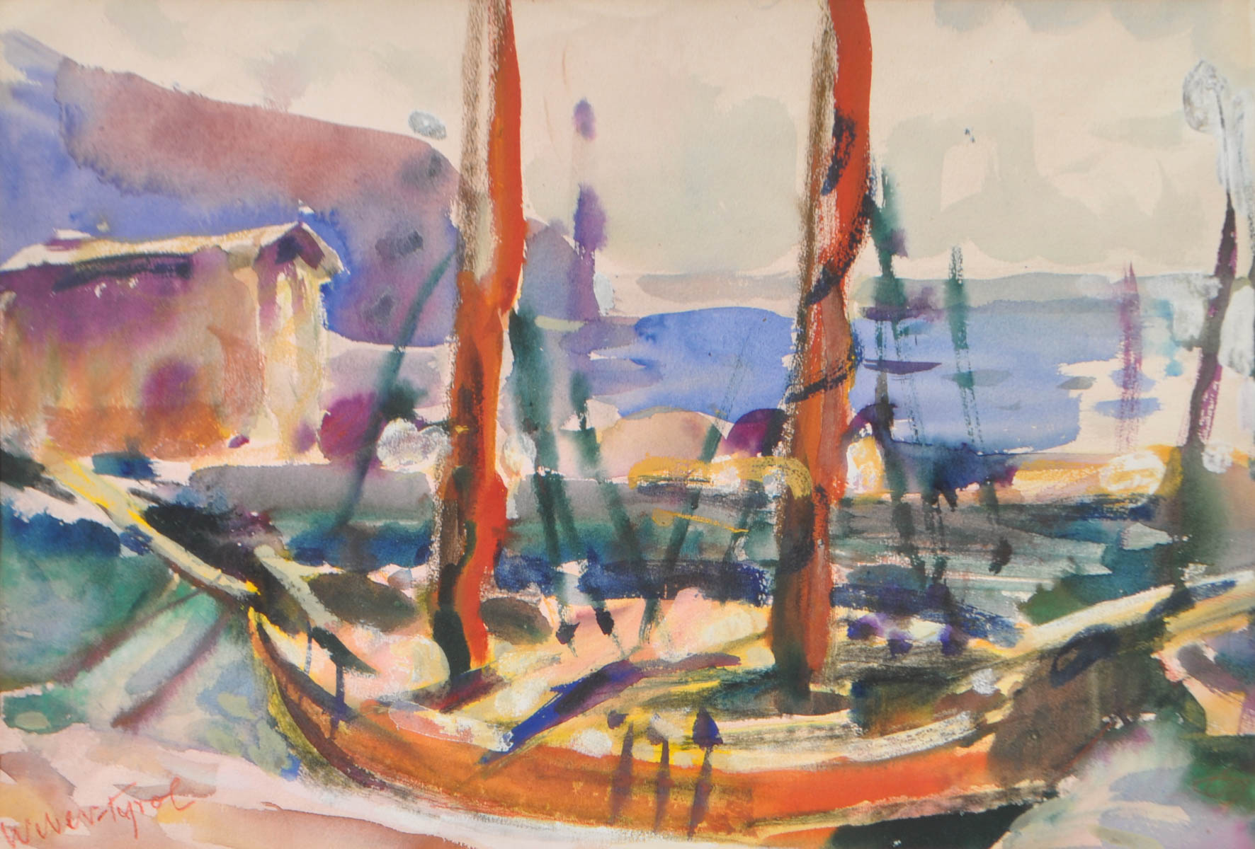 Hans Josef Weber-Tyrol (Schwaz 1874 - Meran/Merano) Barca a vela nel porto;Acquerello, 31,5 x 45,5 cm, in cornice