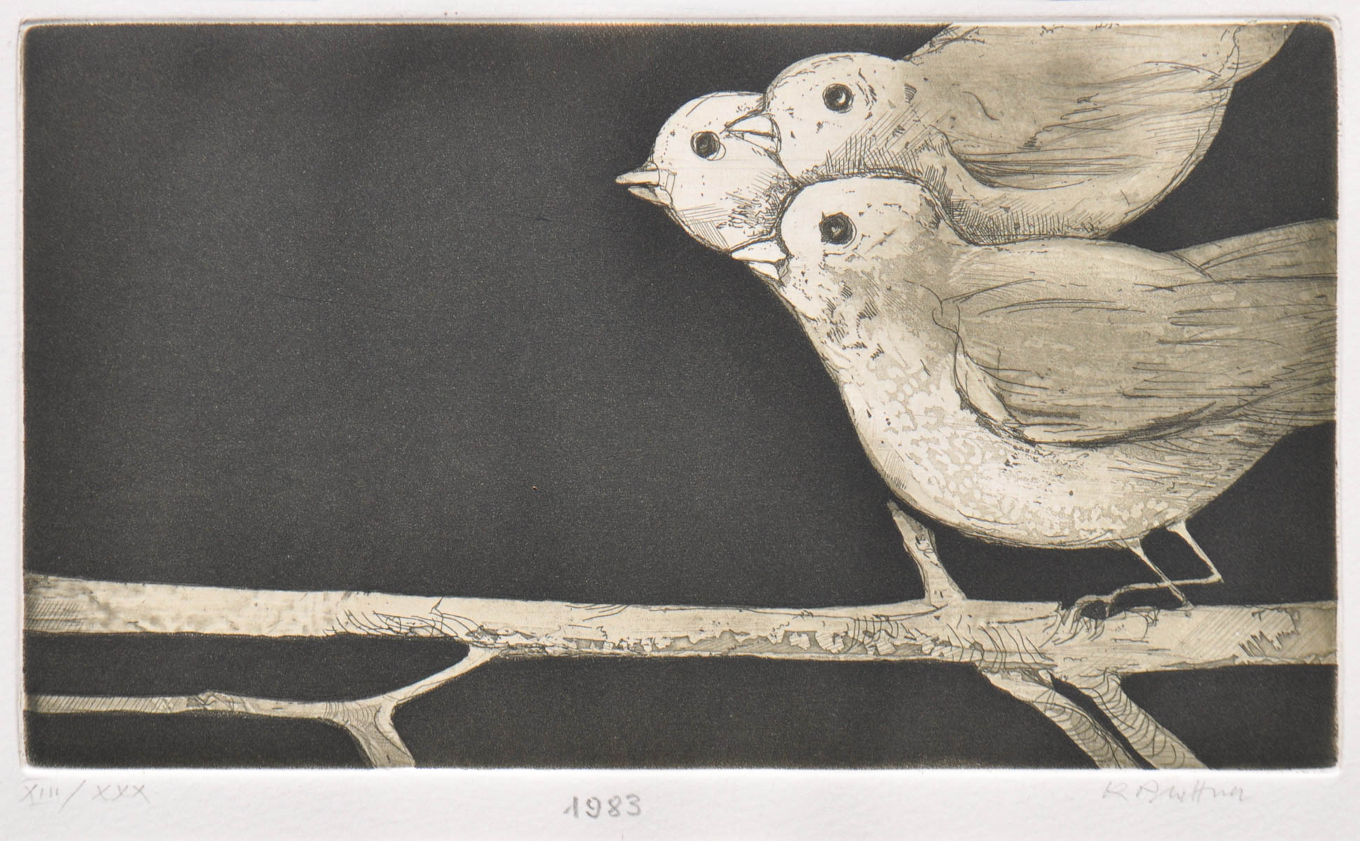 Karl Plattner (Mals/Malles 1919 - Mailand/Milano 1986) Uccellino/i, 1983;Acquaforte a colori, 9,8 x 17,5 cm (immagine)