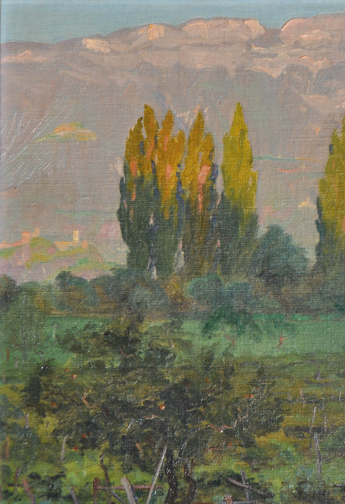 Richard Wolff (Esseg 1880 - Bozen/Bolzano 1964) Impressione di mattina presso Bolzano (Mendola);Olio su cartone, 29,5 x 20,5 cm, in cornice