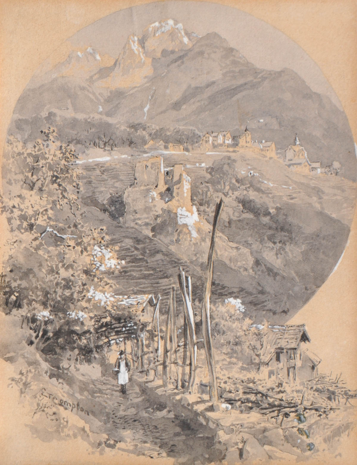 Edward Theodore Compton (London 1849 - Feldafing am Starnberger See 1921) Castel Fontana con vista su Tirolo, prima del 1903;China acquerellata, biacca, 24 x 18 cm, in cornice
