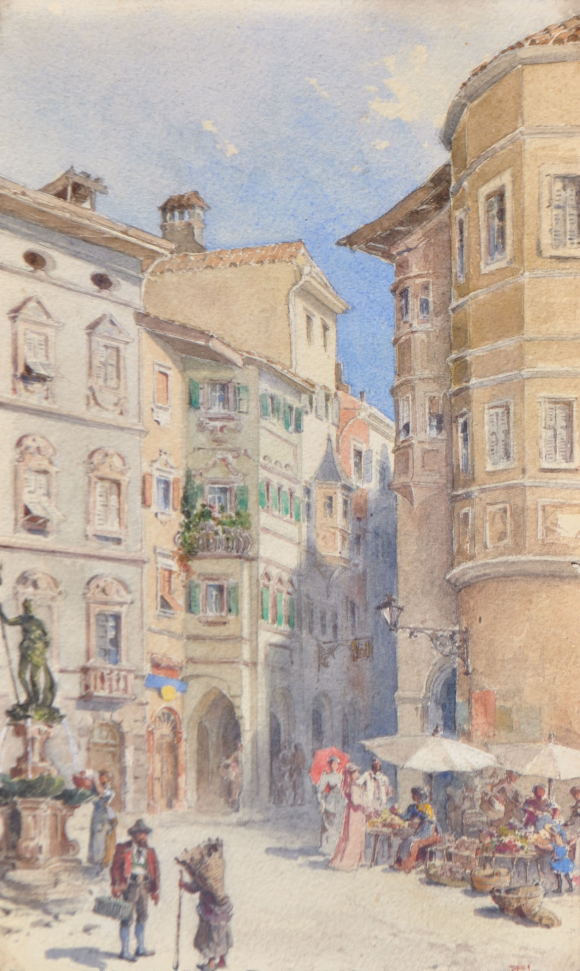 Lot 455 | Ernst Fries Mercato della frutta Bolzano, 1900 ca.;Acquerello, 25 x 15 cm, in...